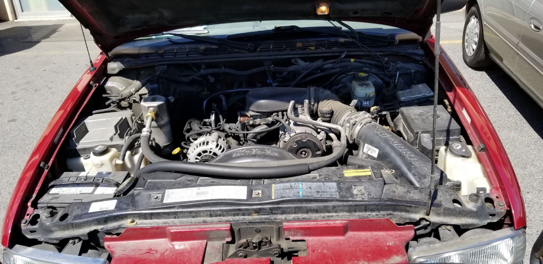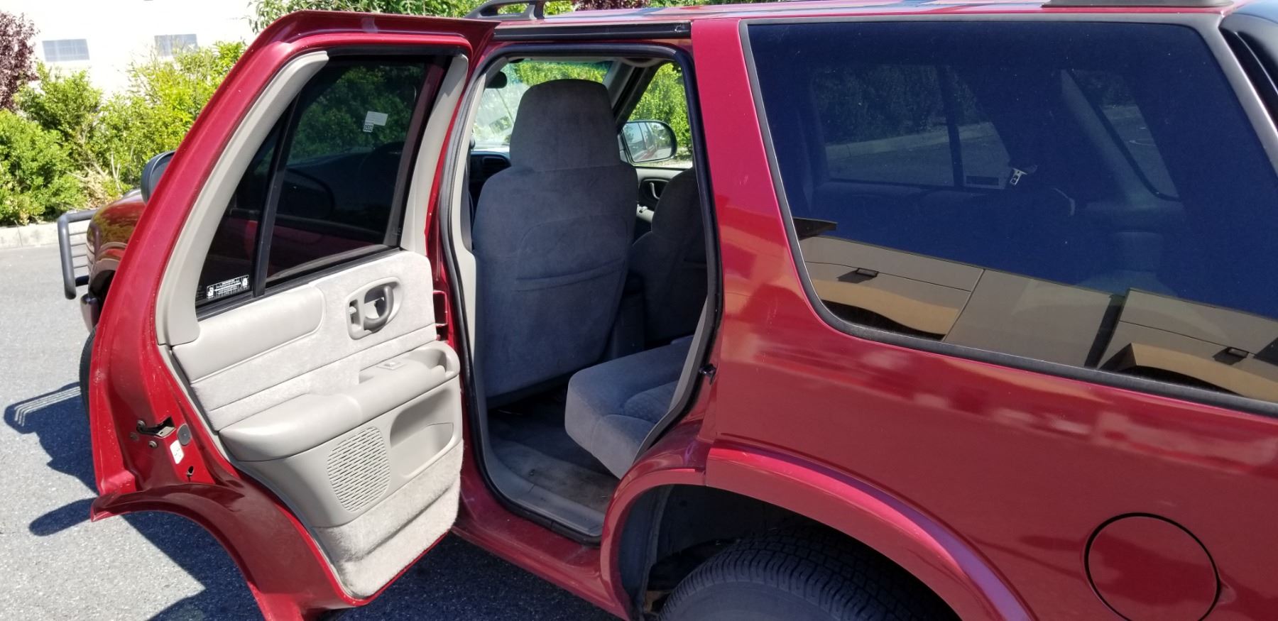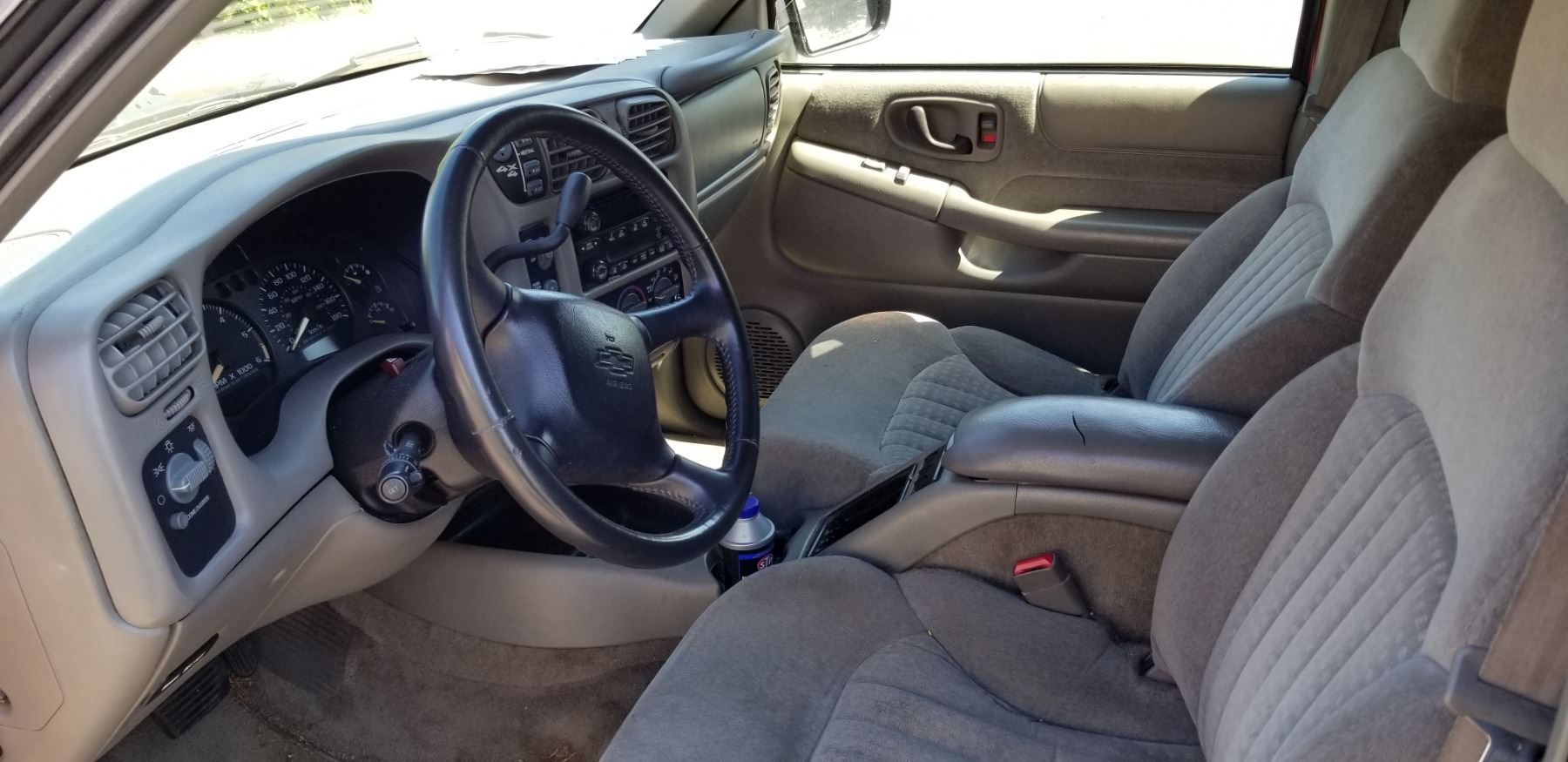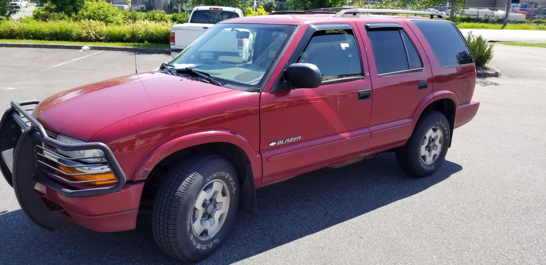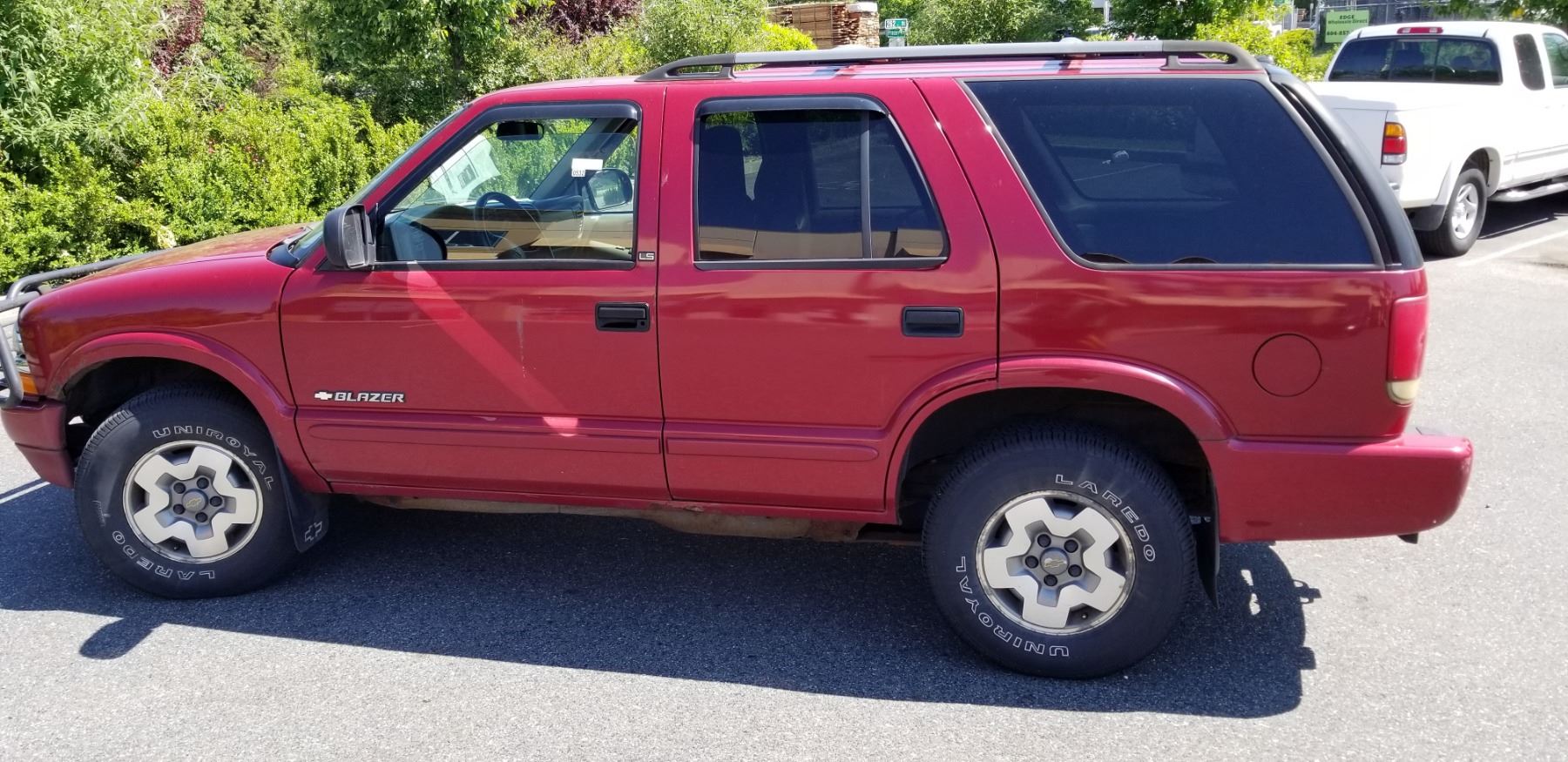 2002 CHEVROLET BLAZER, RED, 4 DOOR, 282000KMM 4X4 WORKS, AC NEEDS RECHARGE, DRIVERS SIDE DOOR LOCK NEEDS REPLACEMENT, REAR WIPER DOES NOT WORK, BRAKE LIGHT POSSIBLE LEAK, KEY FOB NEEDS BATTERY