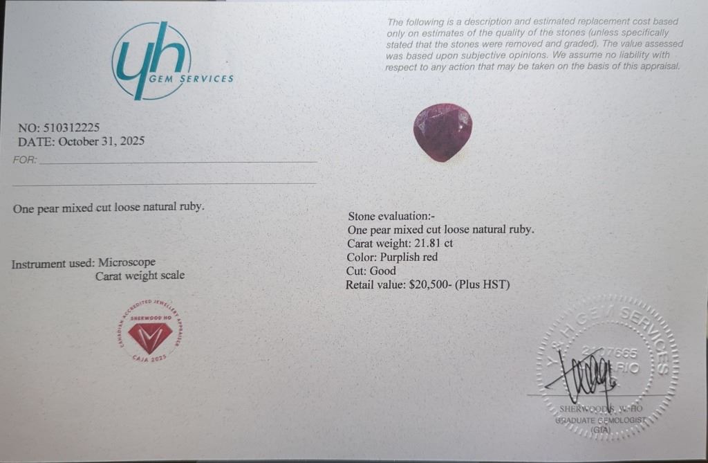 21.81 CT CERTIFIED RUBY GEMSTONE ($20,500 APPRAISAL)