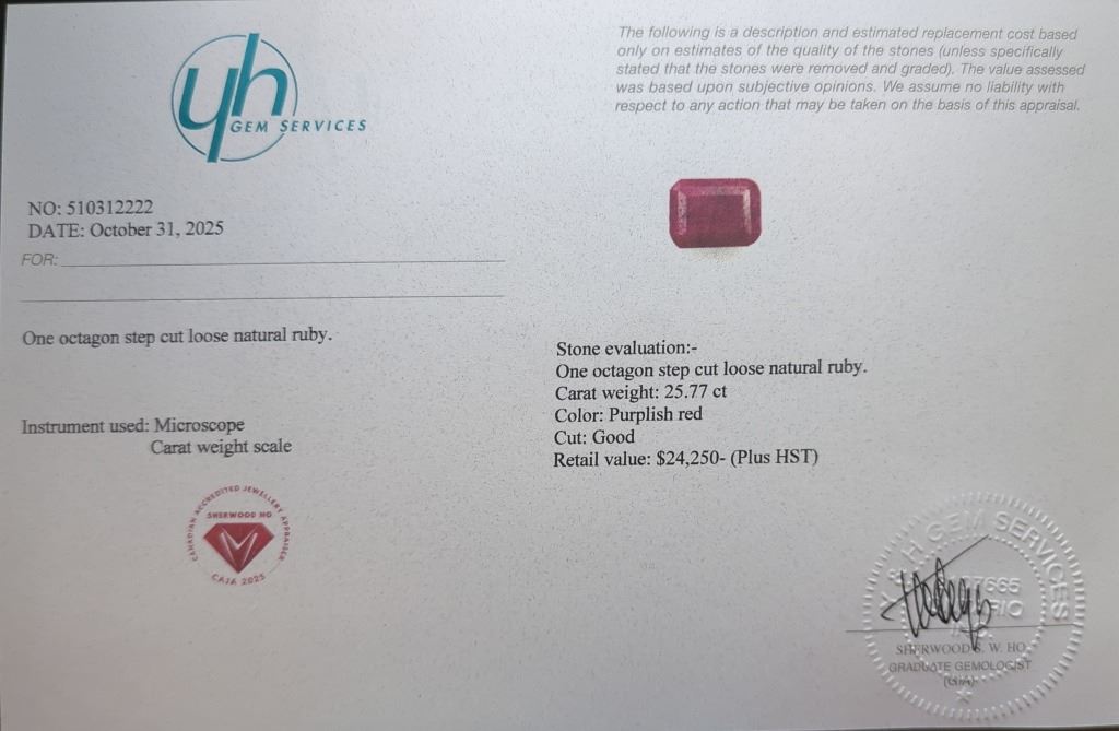 25.77 CT CERTIFIED RUBY GEMSTONE ($24,250 APPRAISAL)