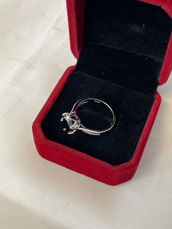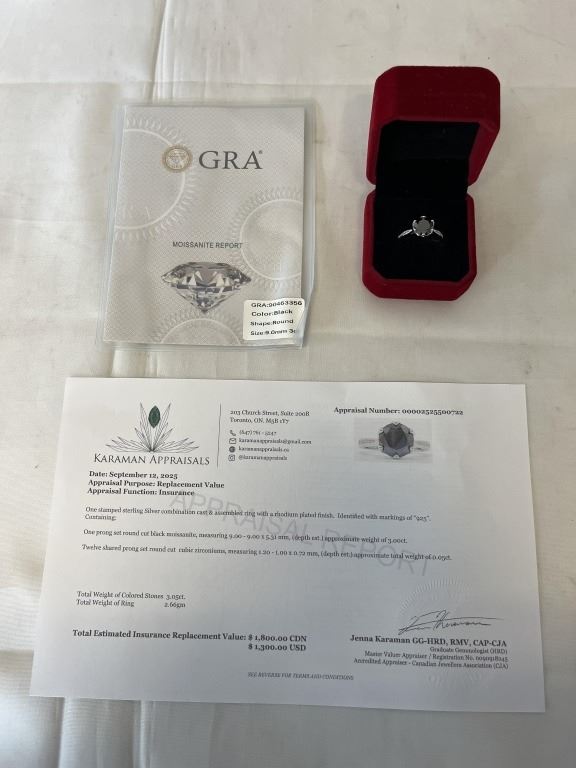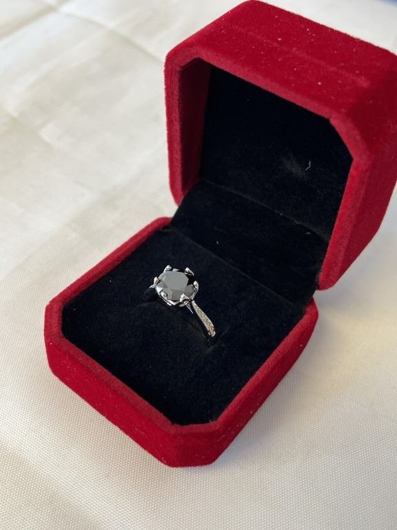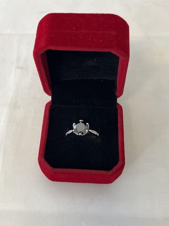 3.00 CT GRA CERTIFIED ROUND BRILLIANT CUT MOISSANITE STONE VVS BLACK COLOR WITH 12 ROUND BRILLIANT CUT CUBIC ZIRCONIA SET IN SHANKS SET IN 925 SILVER RING SIZE 7.25 RETAIL VALUE $1,800.00