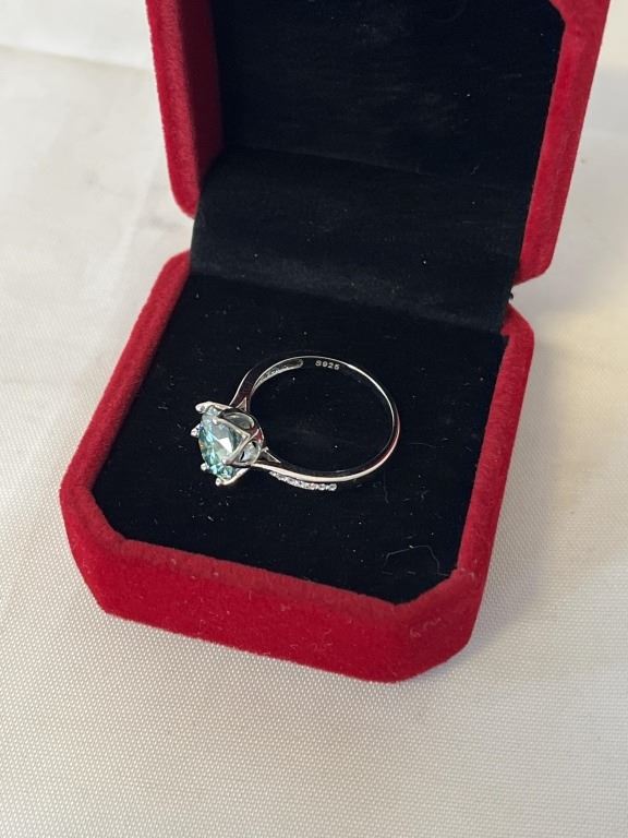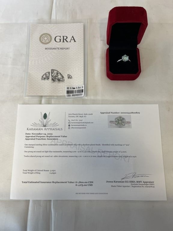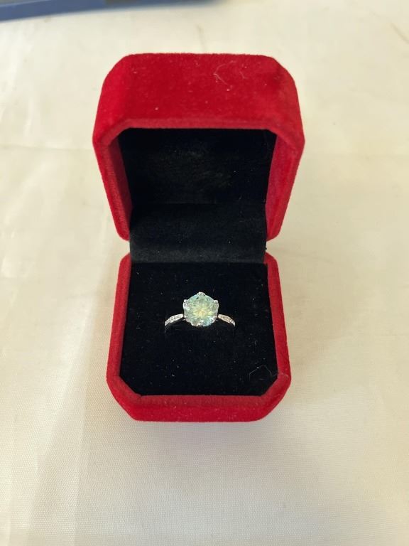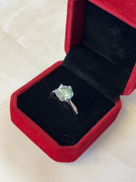 3.00 CT GRA CERTIFIED ROUND BRILLIANT CUT MOISSANITE STONE VVS LIGHT BLUE COLOR WITH 12 ROUND BRILLIANT CUT CUBIC ZIRCONIA SET IN SHANKS SET IN 925 SILVER RING SIZE 7.25 RETAIL VALUE $1,800.00