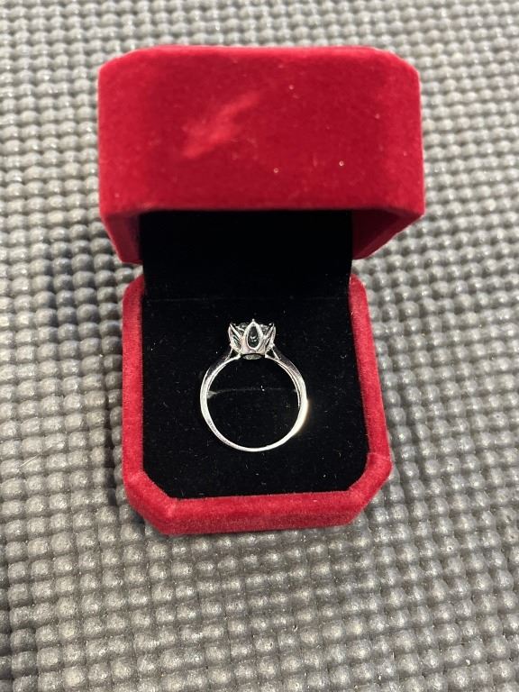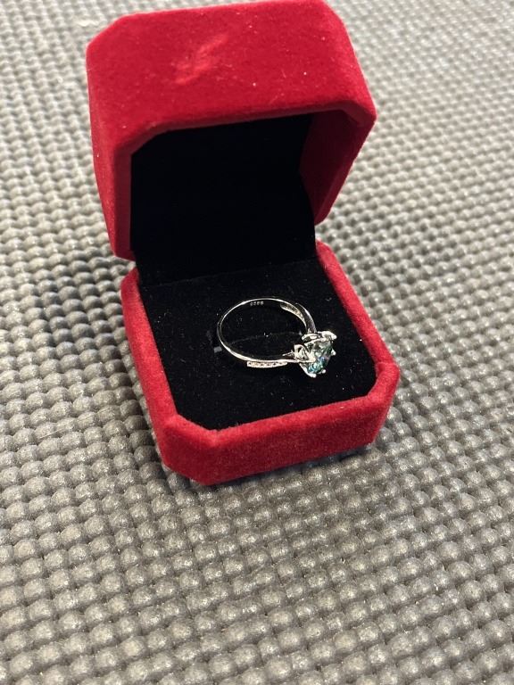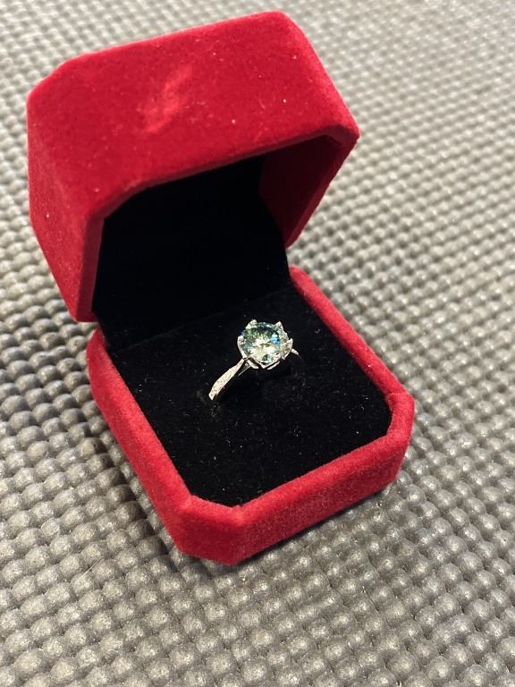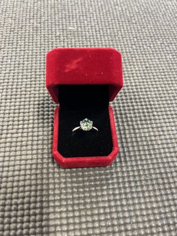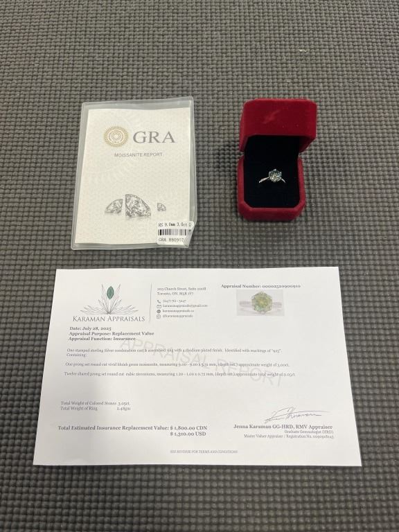 3.00 CT GRA CERTIFIED ROUND BRILLIANT CUT MOISSANITE STONE VVS VIVID BLUISH GREEN COLOR WITH 12 ROUND BRILLIANT CUT CUBIC ZIRCONIA SET IN SHANKS SET IN 925 SILVER RING SIZE 7.25 RETAIL VALUE $1,800.00