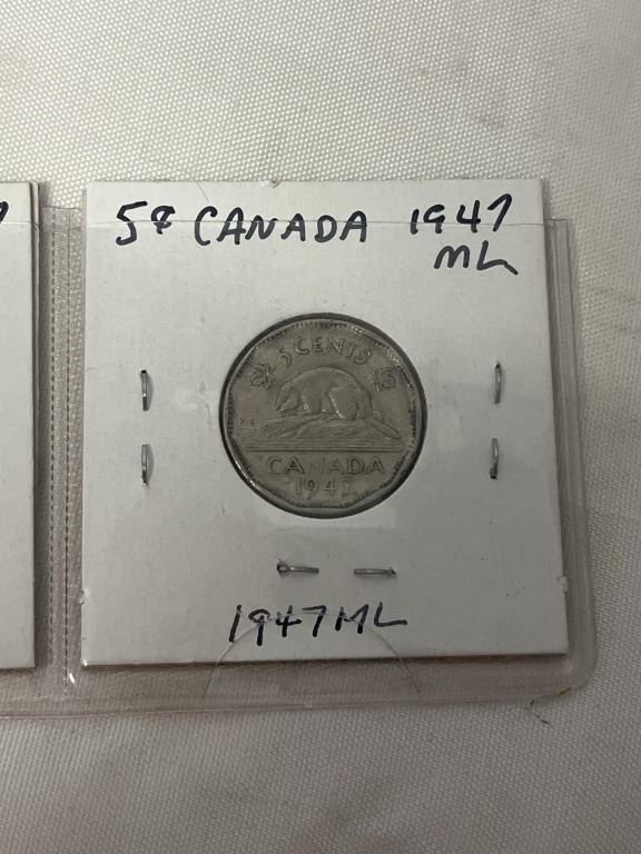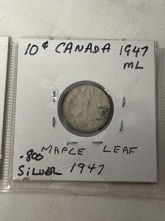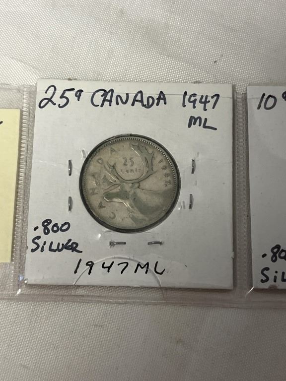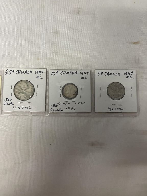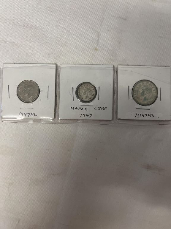 3 1947 MAPLE LEAF CANADIAN COINS 25 CENT, 10 CENT, 5 CENT .800 SILVER