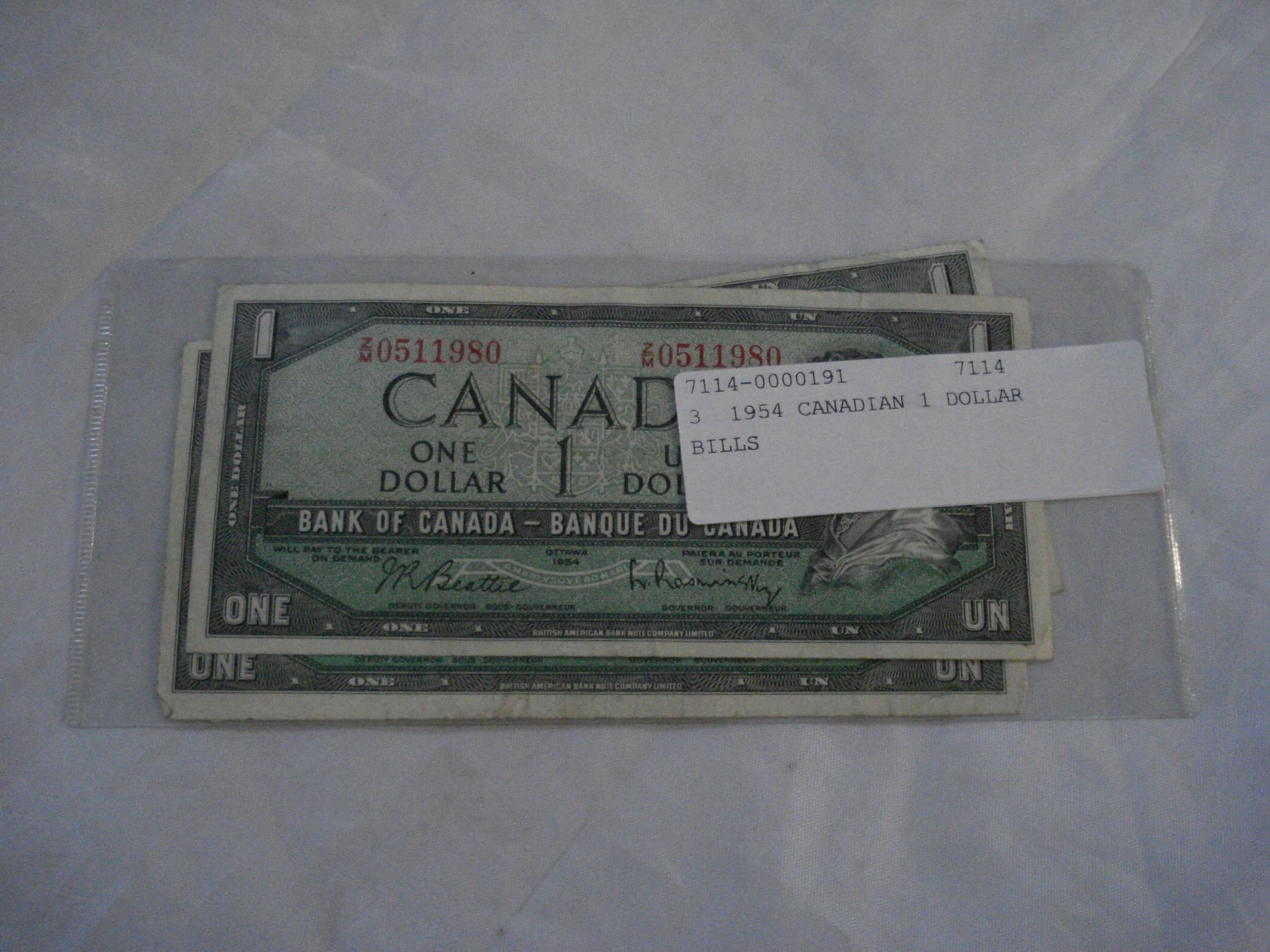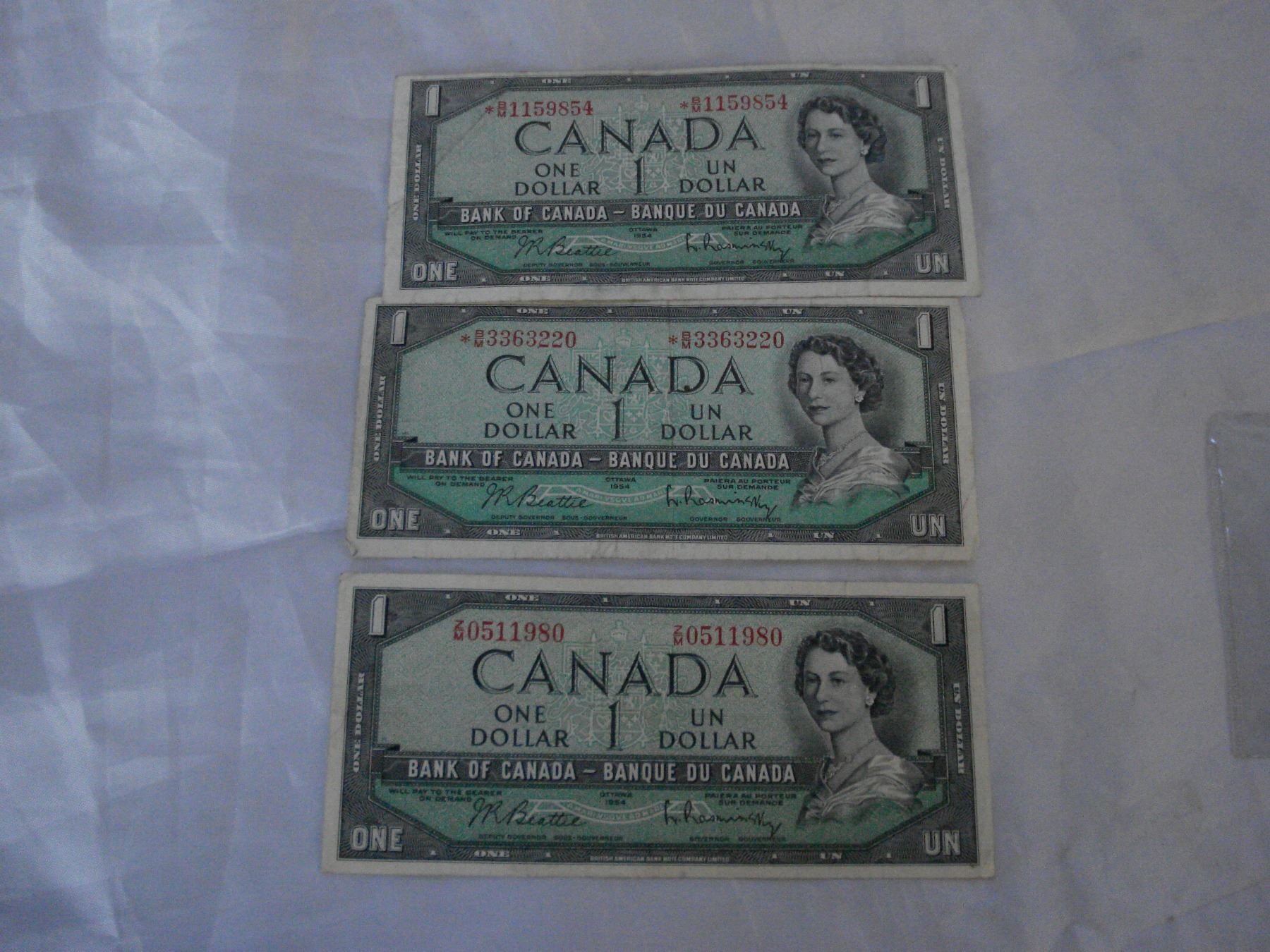 3 1954 CANADIAN 1 DOLLAR BILLS