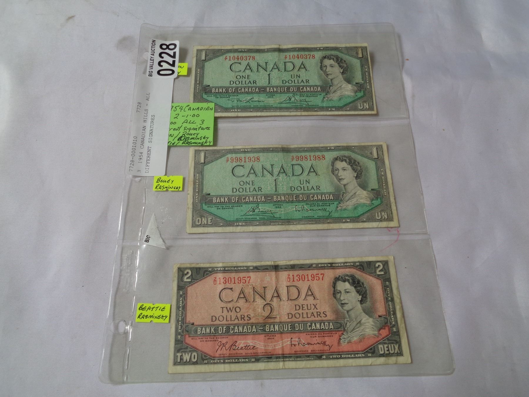 3 1954 CANADIAN BILLS - ALL DIFFERENT SIGNATURES