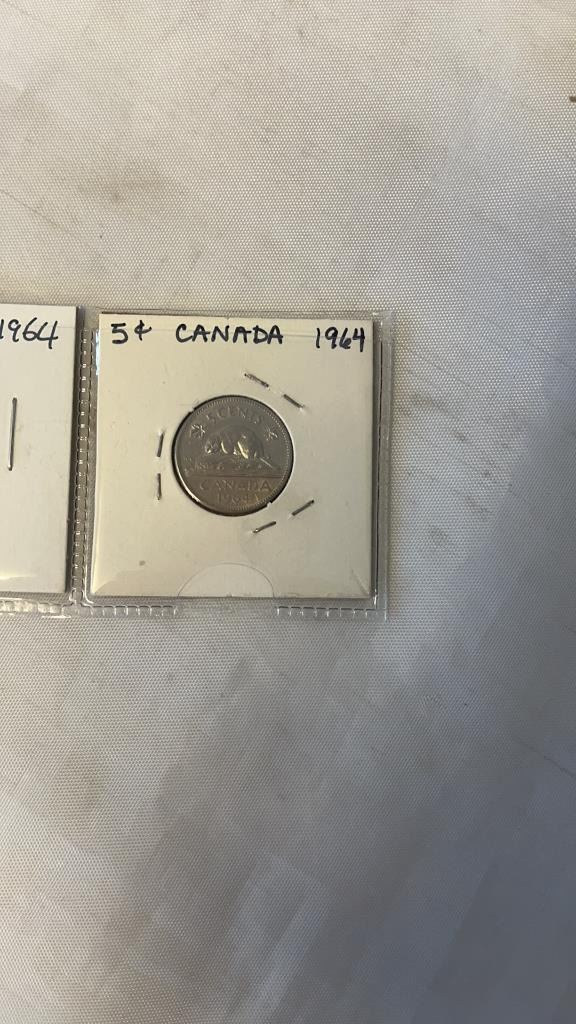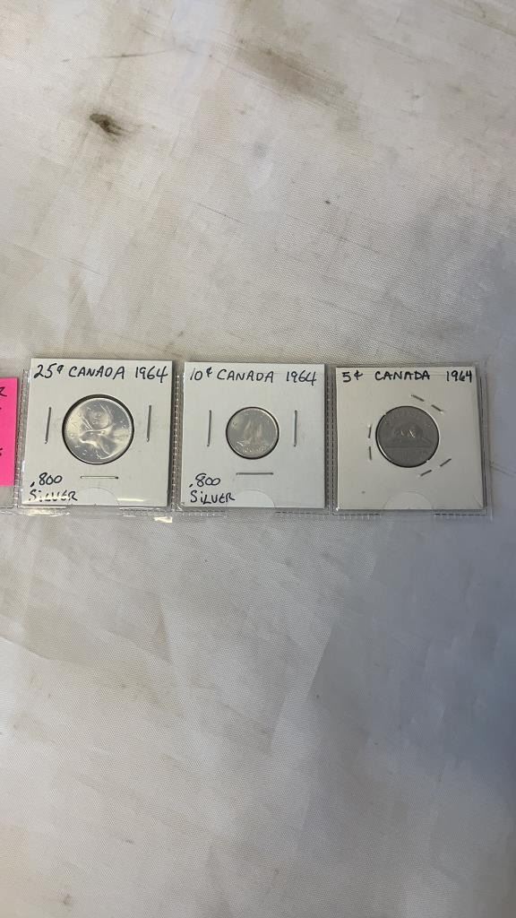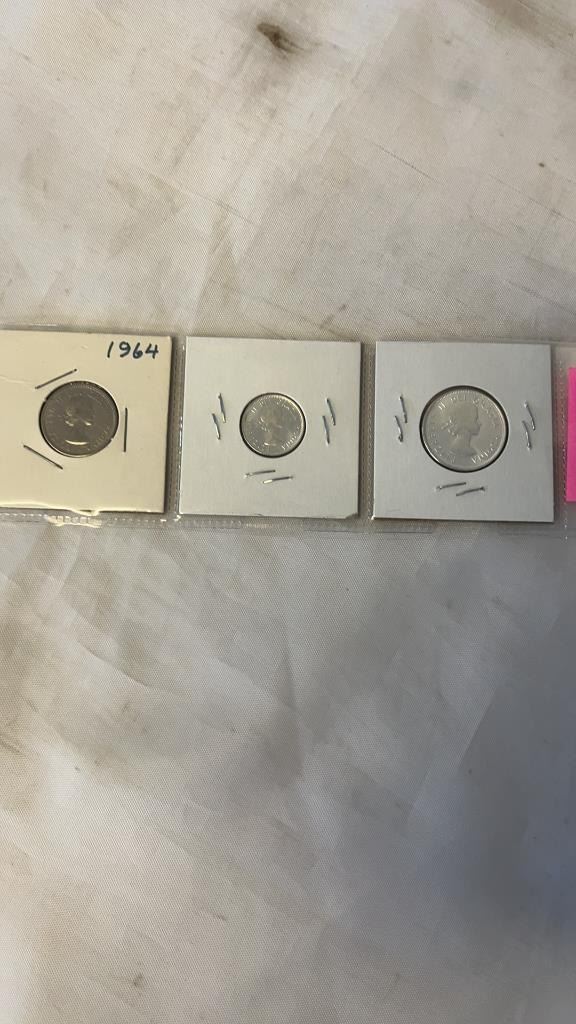3 - 1964 SILVER (.800) CANADIAN COINS - MINT CONDITION 25 CENT, 10 CENT PLUS 5 CENT
