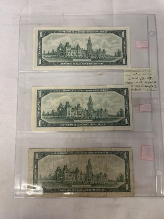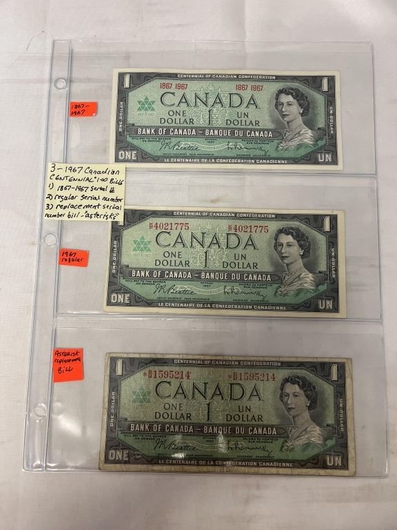 3 1967 CANADIAN CENTENNIAL $1 BILLS, 1867-1967 SERIAL, REGULAR SERIAL # AND REPLACEMENT SERIAL NUMBER ASTERICKS