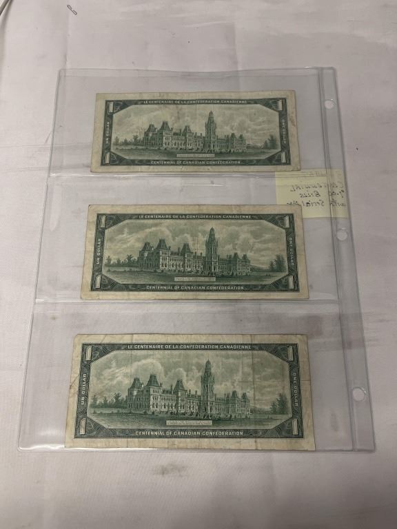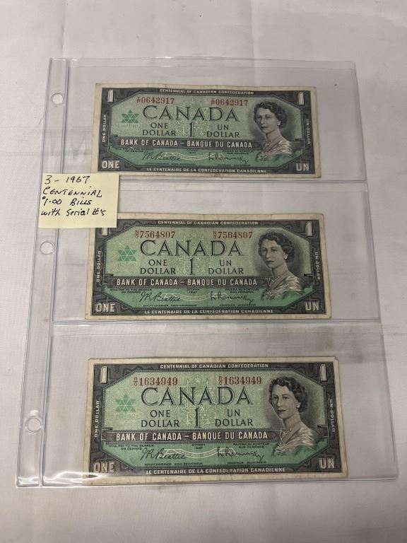 3 1967 CENTENNIAL $1 BILLS W/ SERIAL NUMBERS