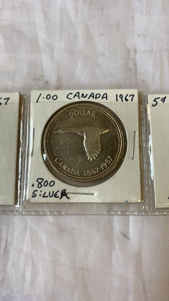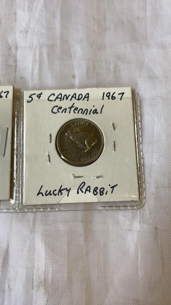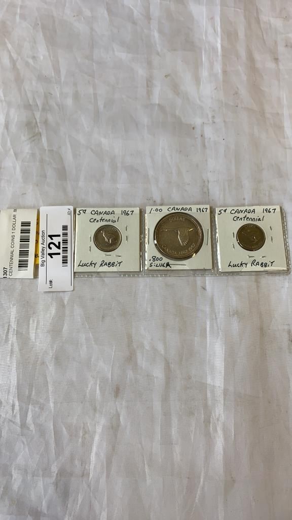 3 1967 CENTENNIAL COINS 1 DOLLAR .800 SILVER AND 2 LUCKY RABBIT NICKELS