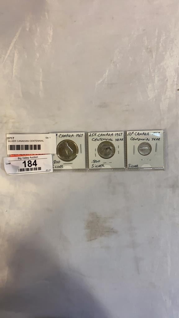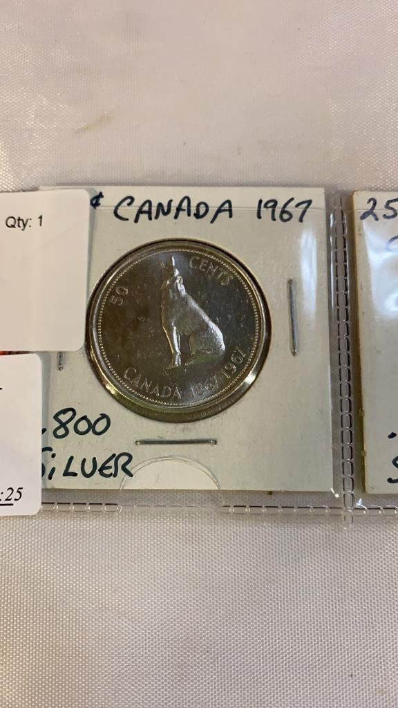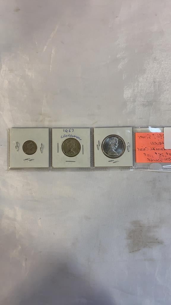 3 1967 SILVER CANADIAN CENTENNIAL COINS - 50 CENT, 25 CENT, 10 CENT .800 SILVER