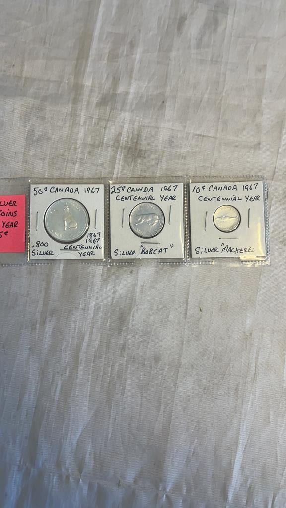 3- 1967 SILVER CANADIAN COINS CENTENNIAL YEAR 50 CENT, 25 CENT, 10 CENT