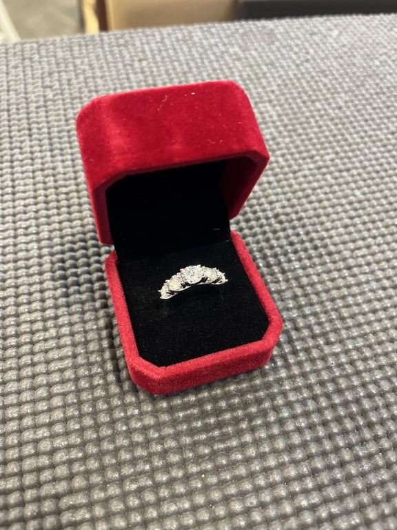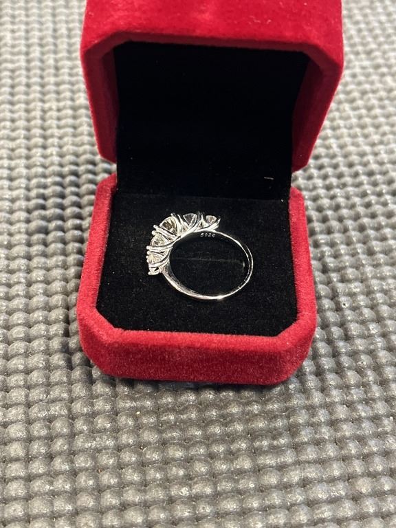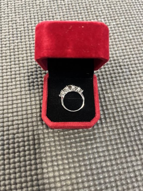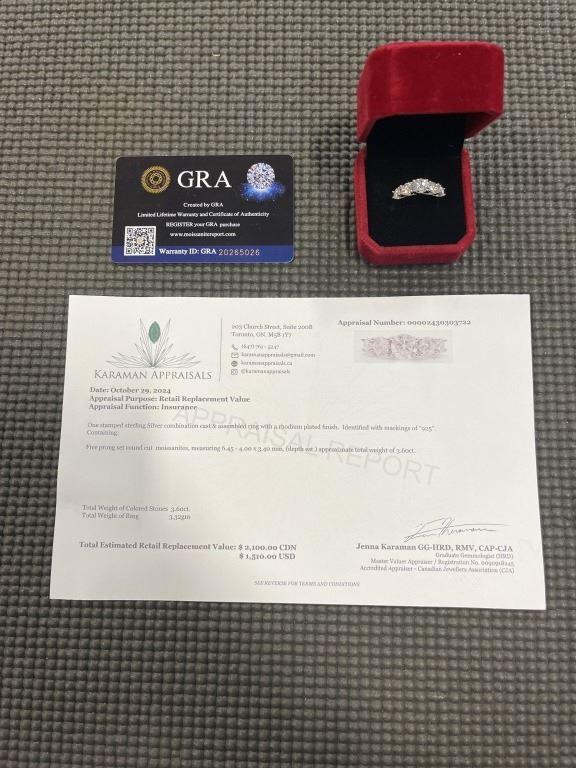 3.60 CT TW GRA CERTIFIED ROUND BRILLIANT CUT MOISSANITE STONES VVS D COLOR WITH THE 5 MOISSANITE STONES SET GRADUATING DOWN IN SIZE FROM CENTER SET IN 925 SILVER RING SIZE 7 RETAIL VALUE $2,100.00