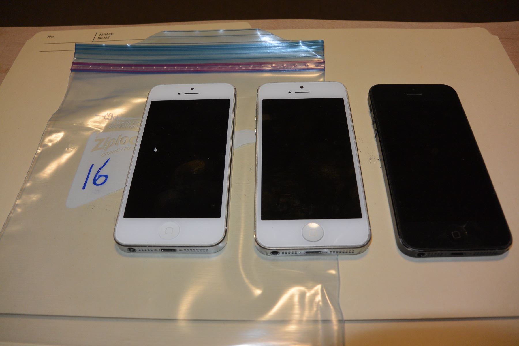 3 APPLE IPHONE 5, 2 WHITE, 1 GREY, TELUS + UNKNOWN SIMS