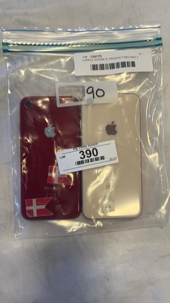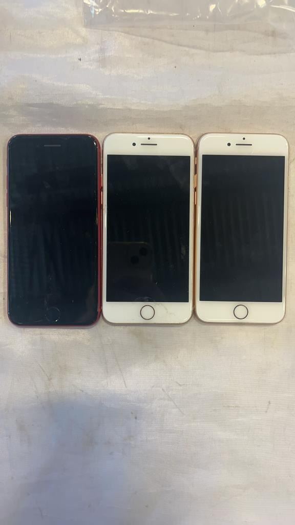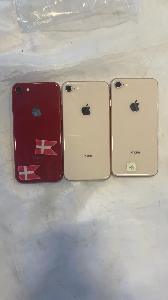 3 APPLE IPHONE 8, PRODUCT RED AND 2 ROSE GOLD - PARTS ONLY, NOT GUARANTEED TO WORK
