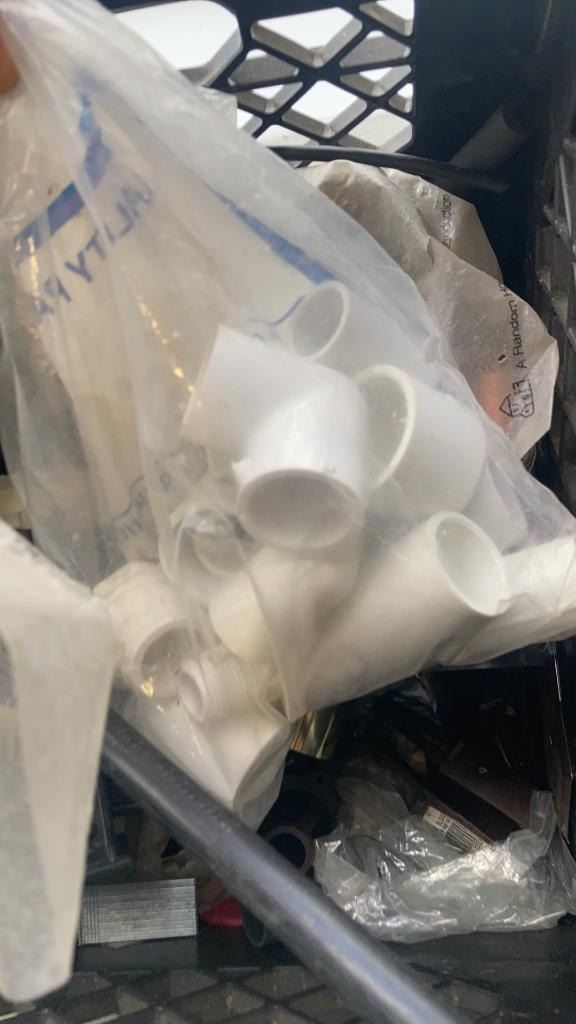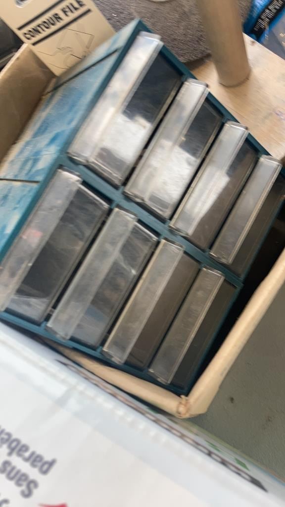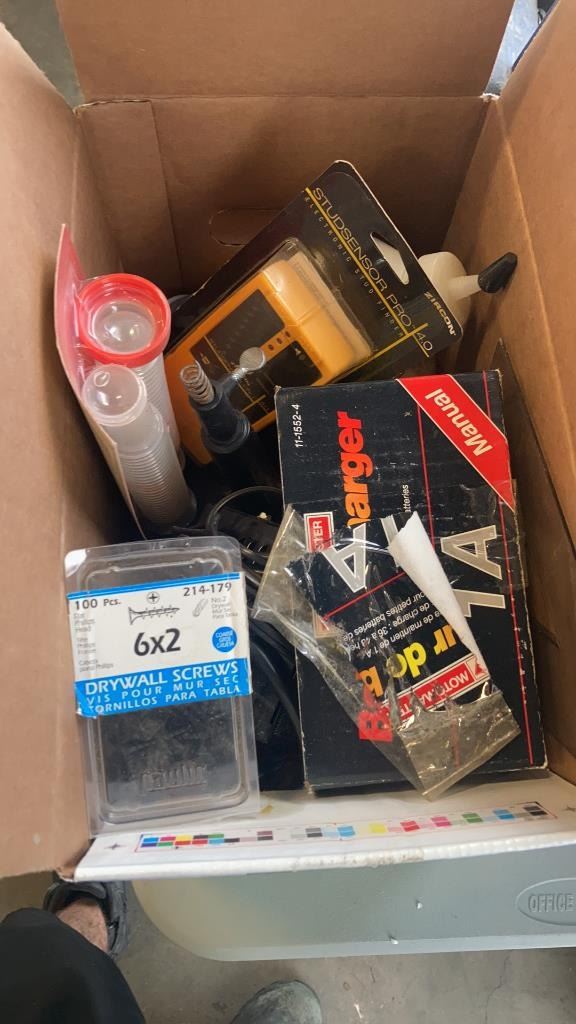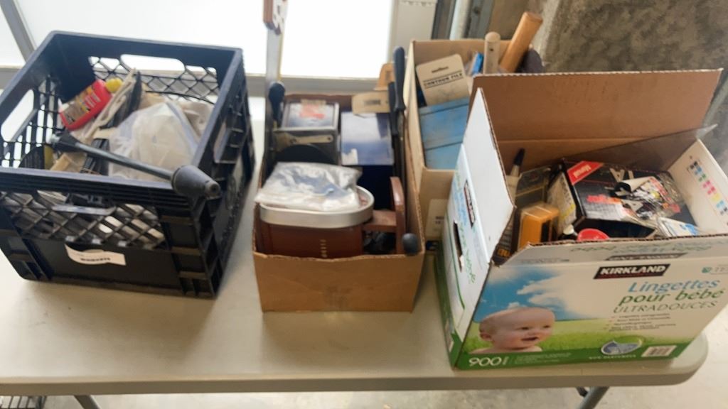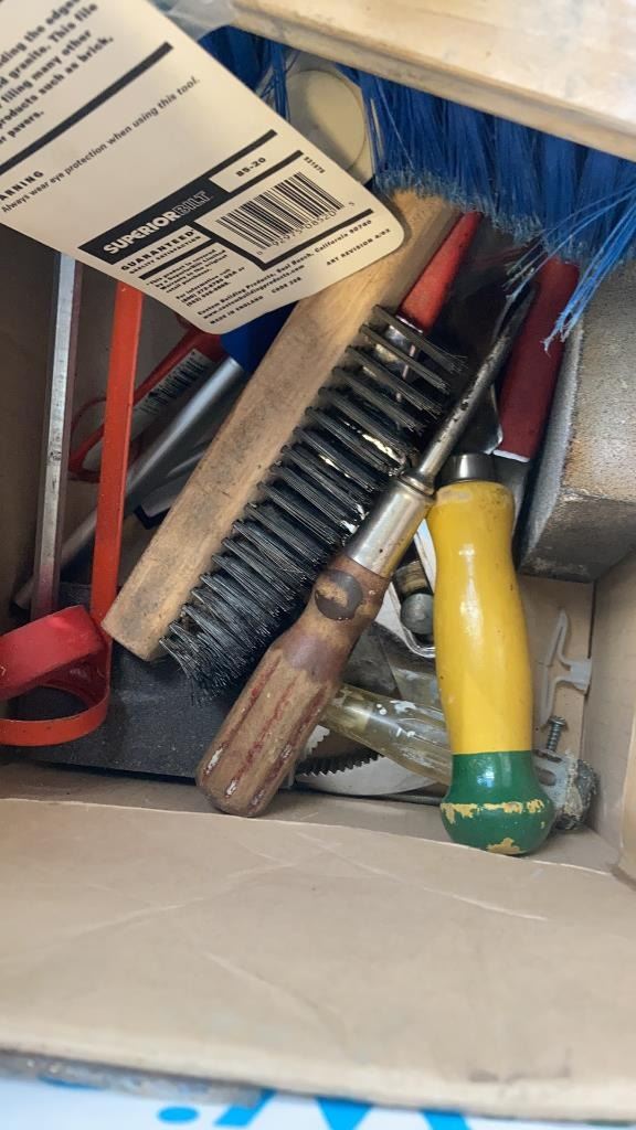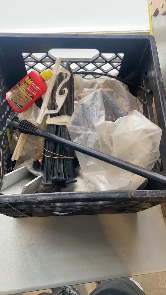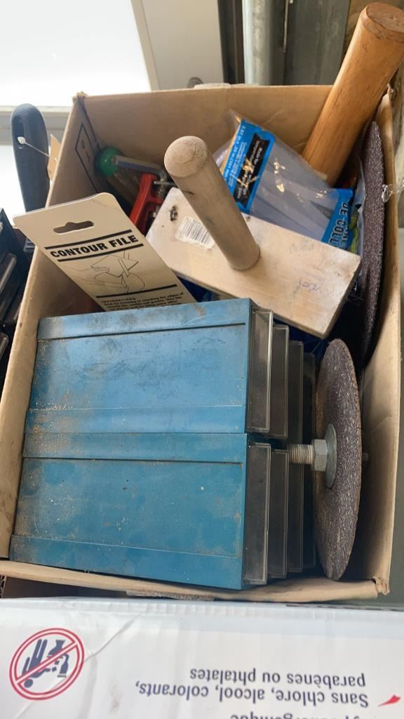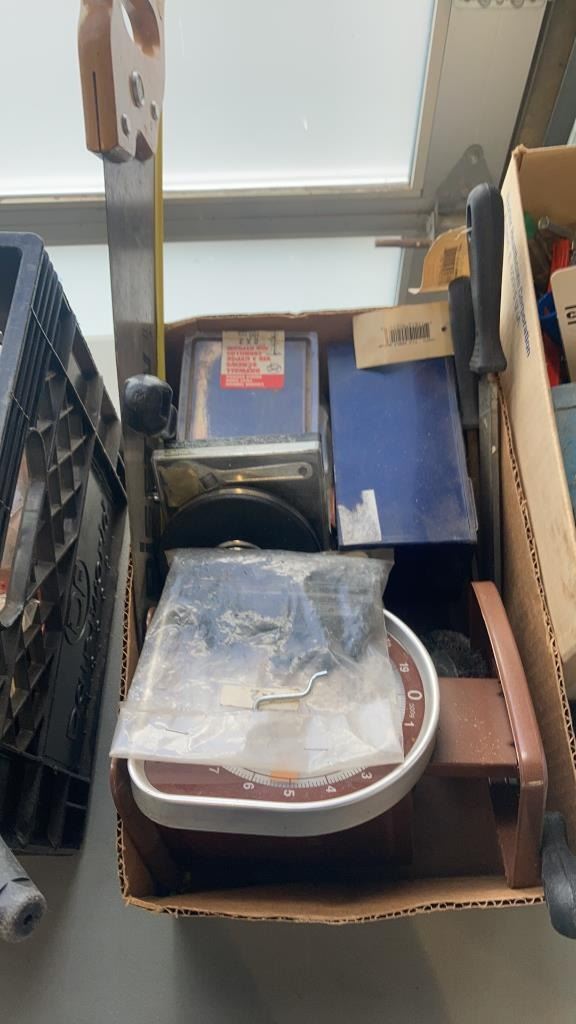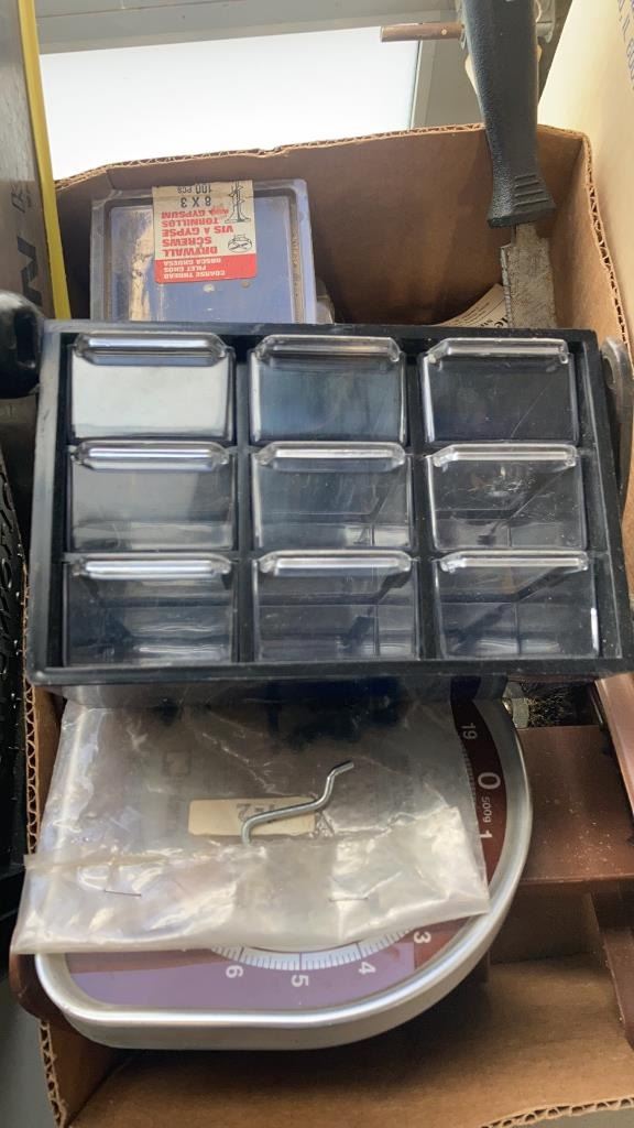 3 BOXES AND CRATE OF TOOLS, PARTS ORGANIZERS, HARDWARE