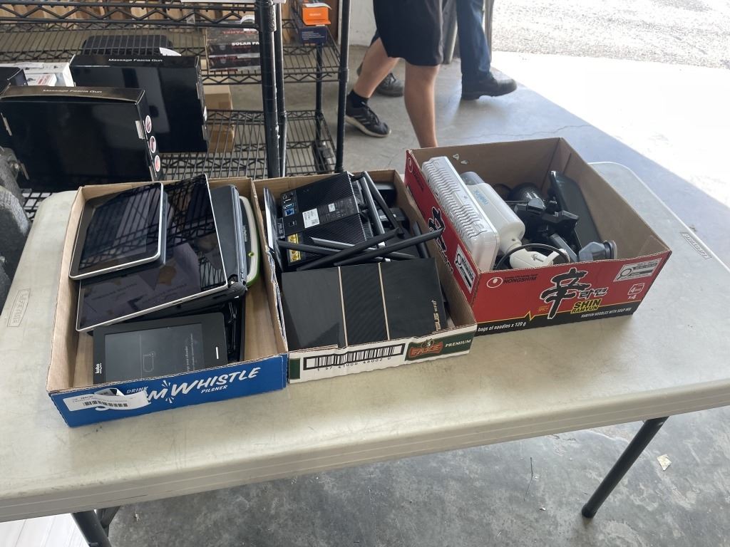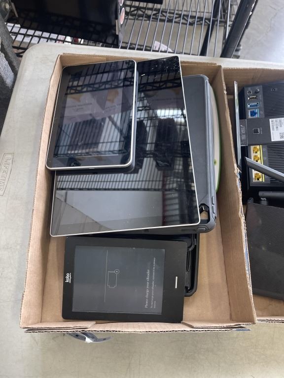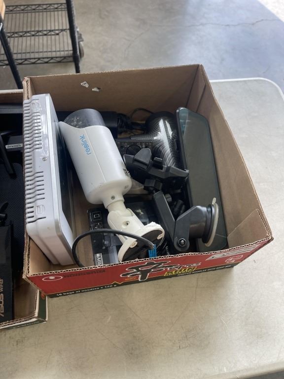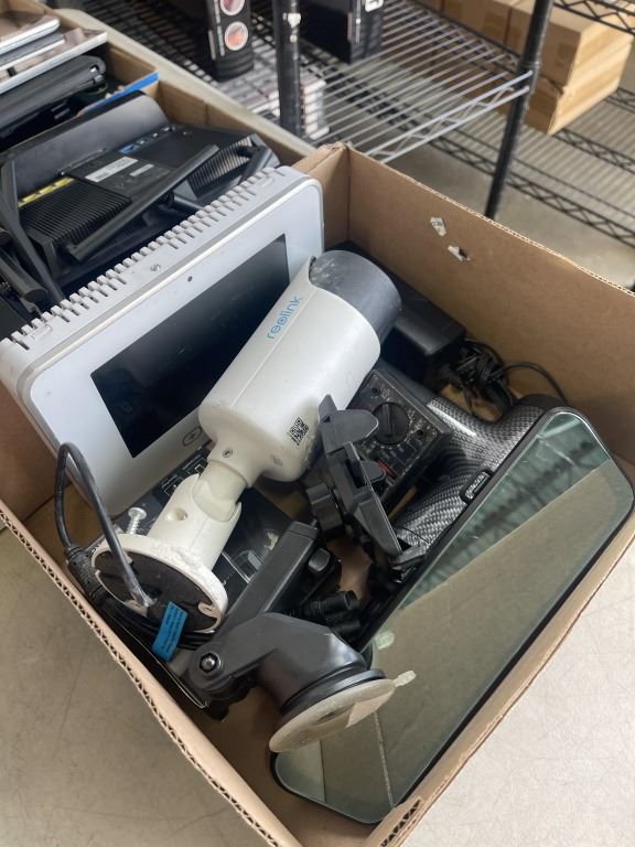 3 BOXES OF ASSORTED ELECTRONICS - TABLETS FOR PARTS, SECURITY CAMERAS, ETC
