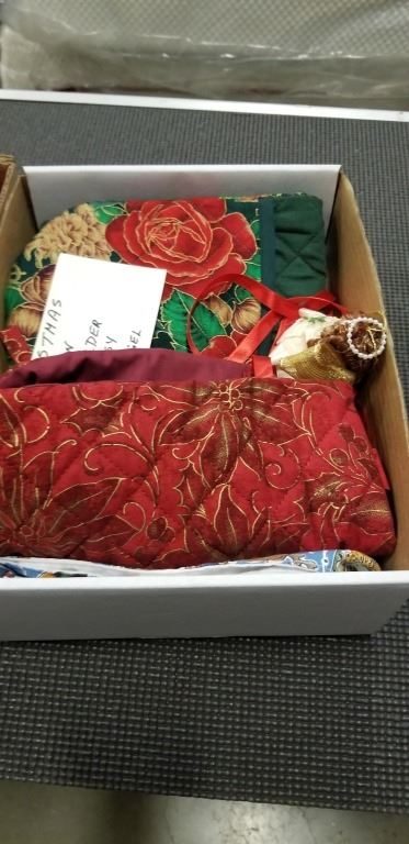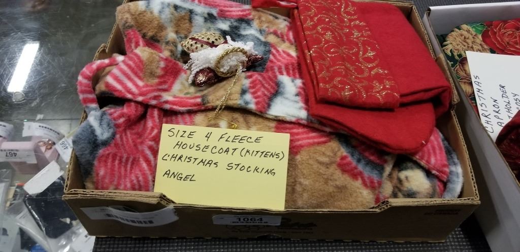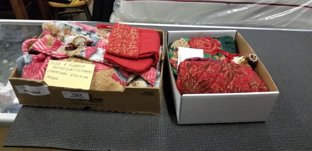 3 BOXES OF CHRISTMAS ITEMS - HOUSE COAT, STOCKING, DECOR, ETC