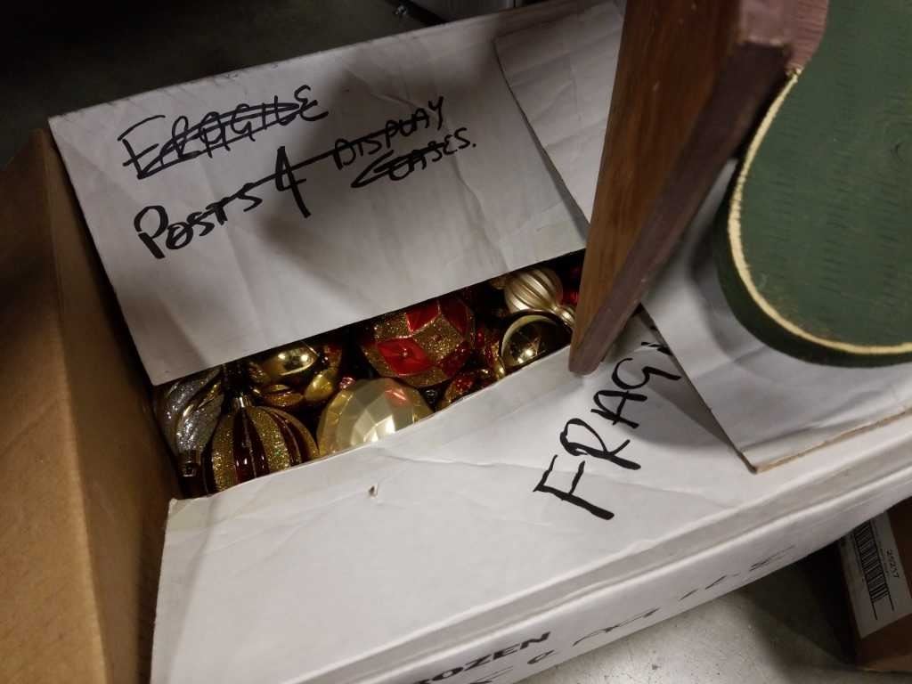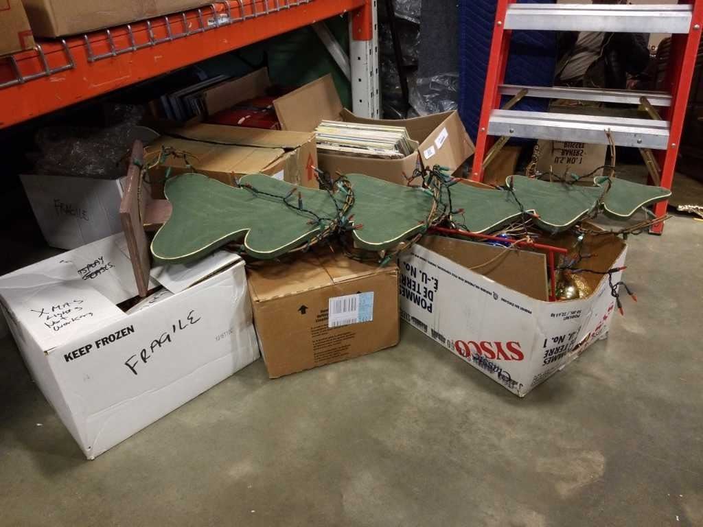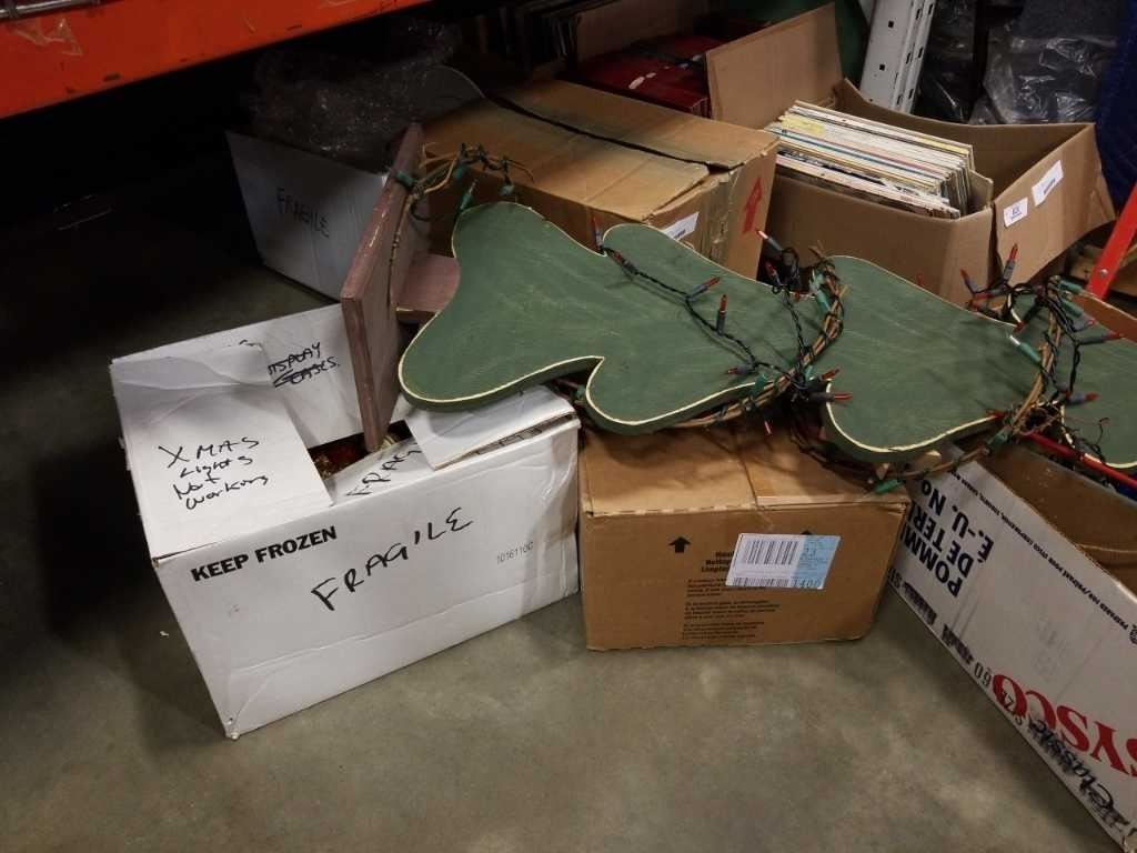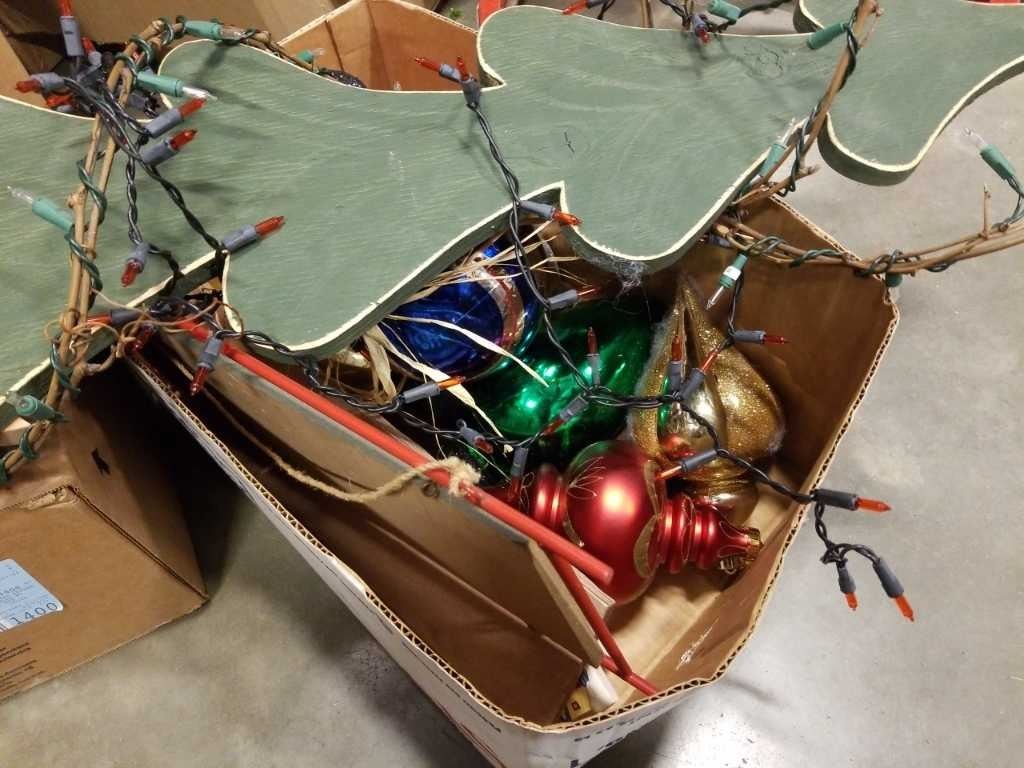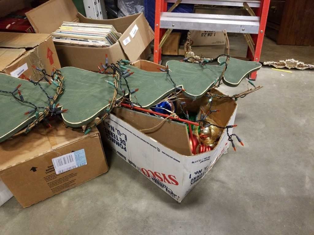 3 BOXES OF CHRISTMAS ORNAMENTS AND WOOD XMAS TREE