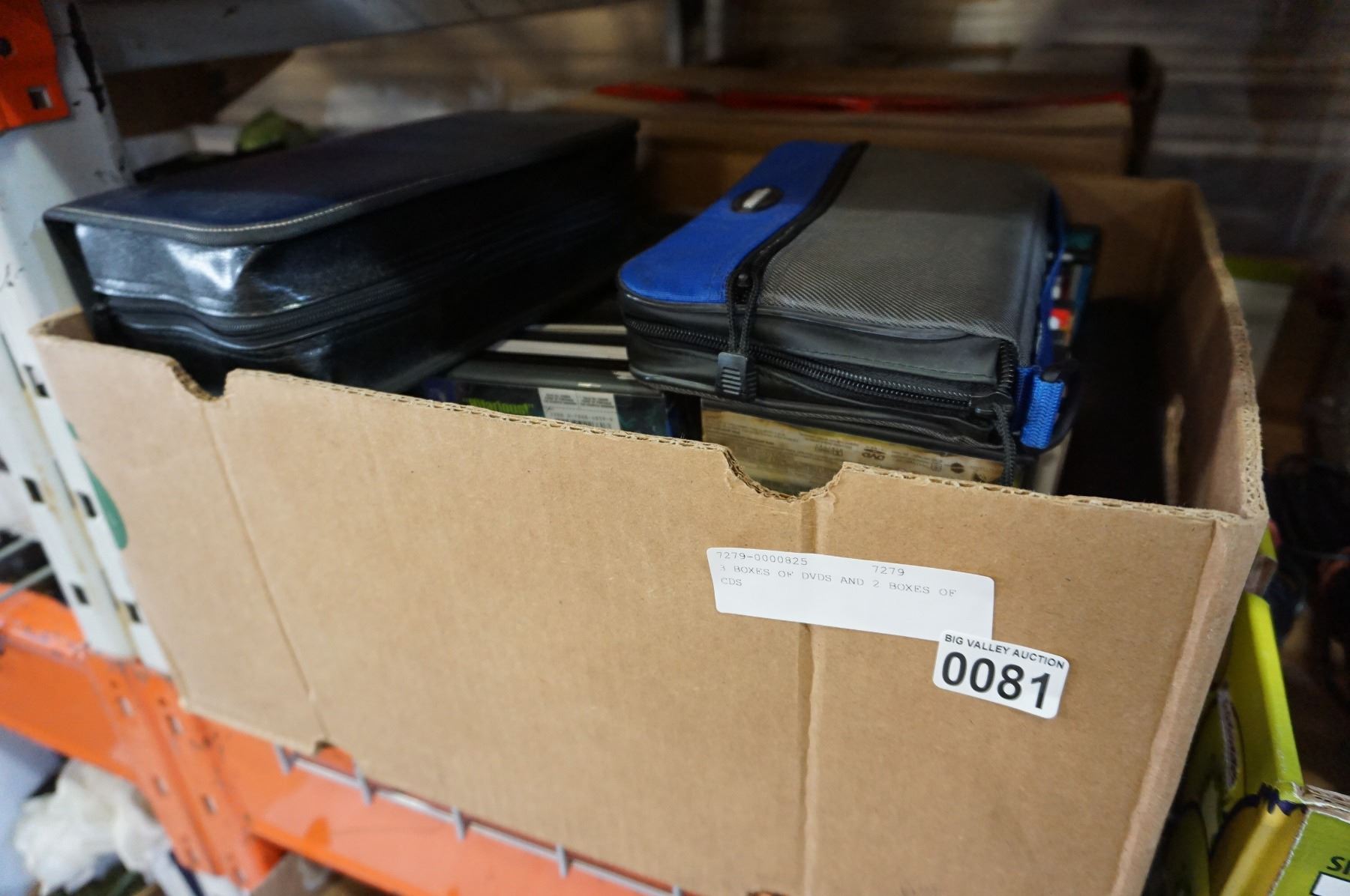 3 BOXES OF DVDS AND 2 BINDERS OF CDS