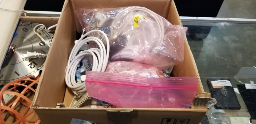 3 BOXES OF ELECTRICAL ITEMS, WORK LIGHT, FLASH LIGHTS, SAW BLADE CLOCK ETC.