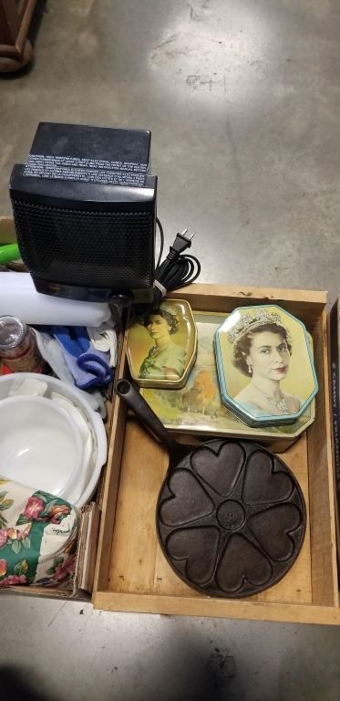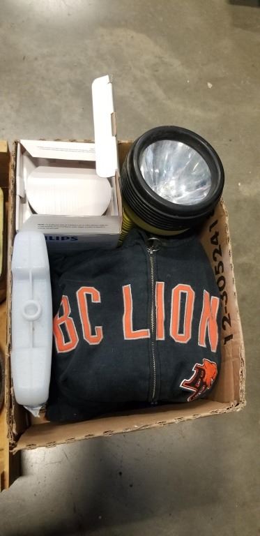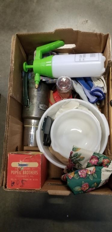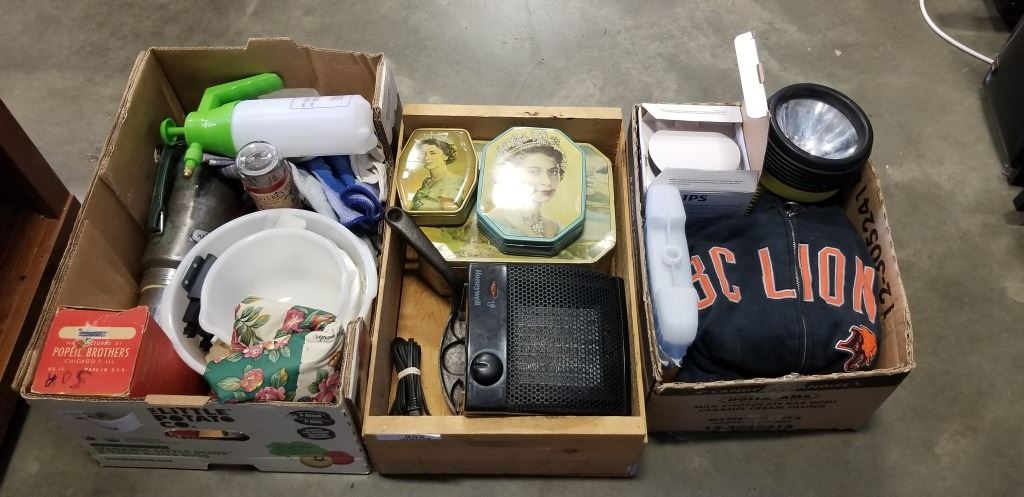 3 BOXES OF ESTATE GOODS - VINTAGE THERMOS, BC LIONS SWEATER, VINTAGE MIXING BOWLS, ETC