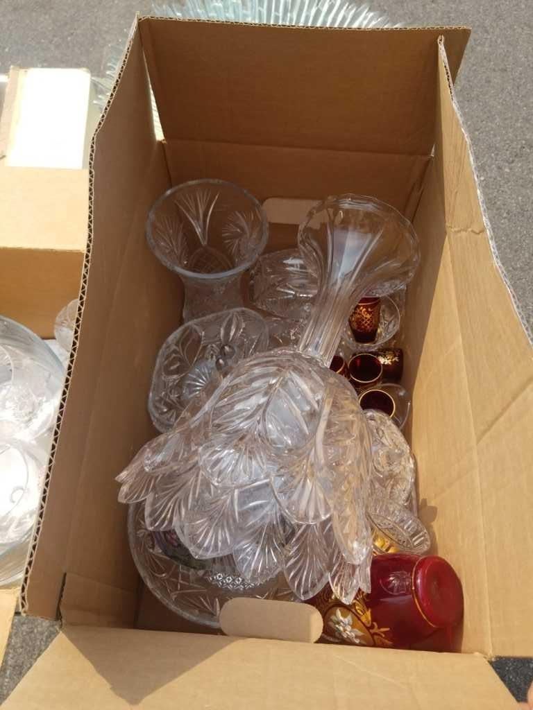 3 BOXES OF GLASS AND CRYSWTAL, GLASS PLATTER AND BOWL, PEDESTAL VASE, STEMWARE, ETC