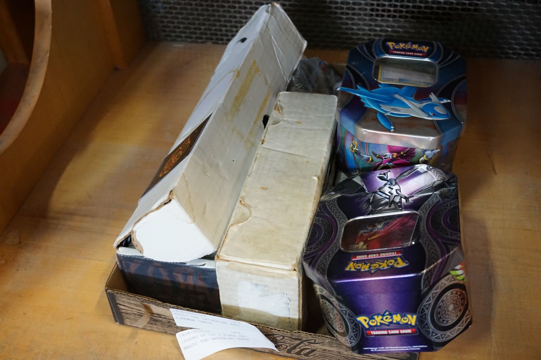 3 BOXES OF LEGEND OF THE 5 RINGS CARDS, 2 TINS OF POKEMON CARDS AND MAGIC THE GATHERING AND DIGIMON CARDS