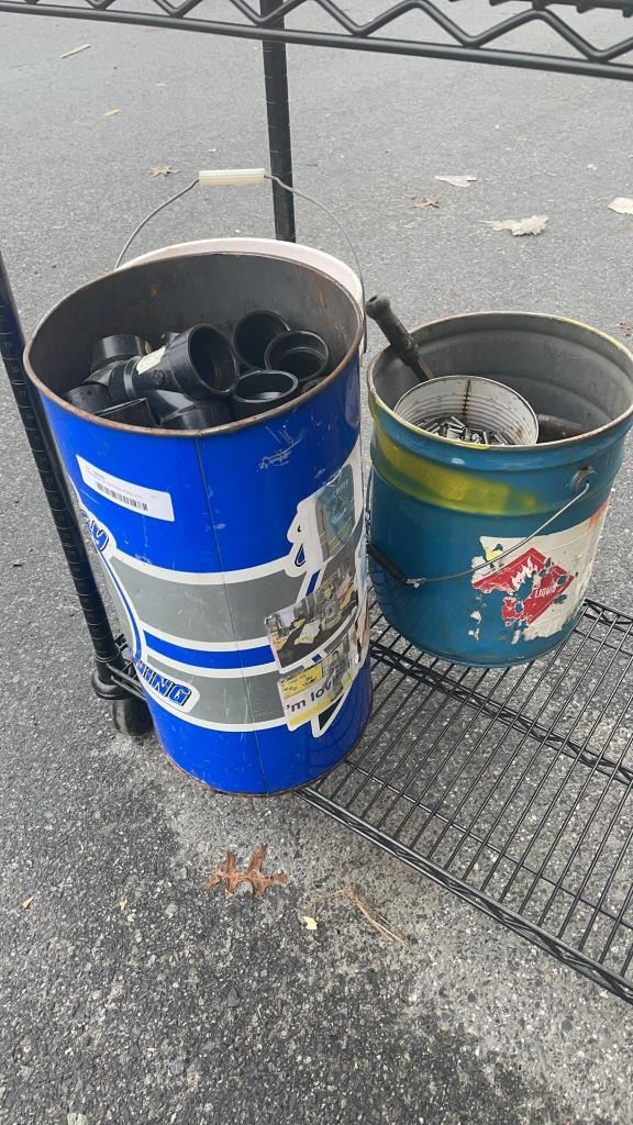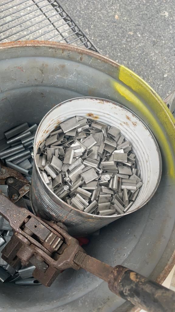 3 BUCKETS OF CUTTING DISCS, PVC CONNECTORS AND BANDING CLAMPS WITH TIGHTENER TOOL