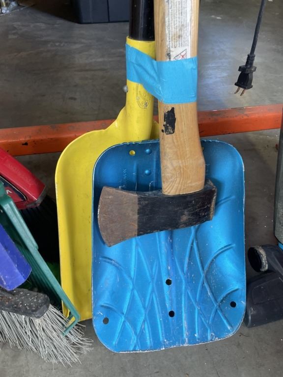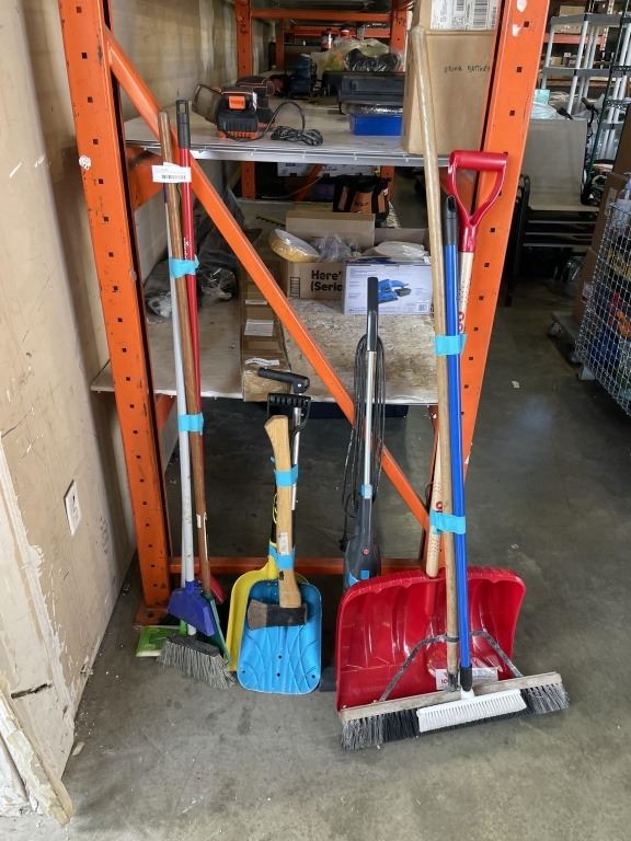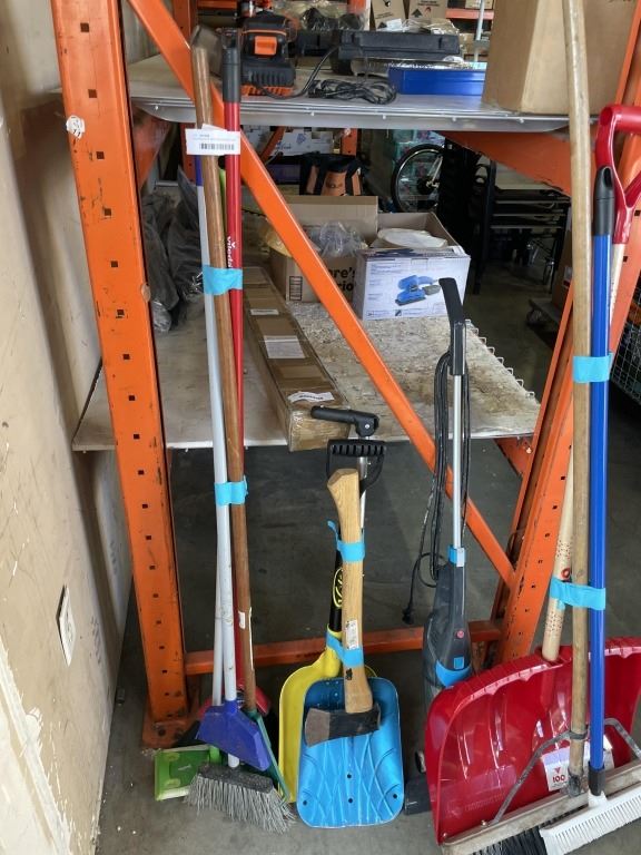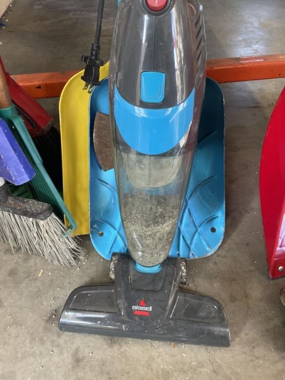 3 BUNDLES OF BROOMS, SHOVELS AND GARDEN TOOLS AND BISSEL VACUUM