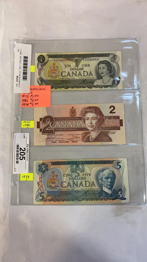 3 CANADIAN BILLS - 1973 1 DOLLAR, 1954 2 DOLLAR, 1979 5 DOLLAR