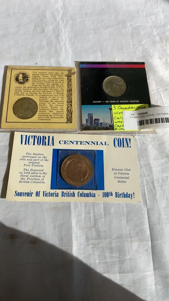 3 CANADIAN COINS - VICTORIA CENTENNIAL, CALGARY 100 YEAR, CAPT. DAMES COOK