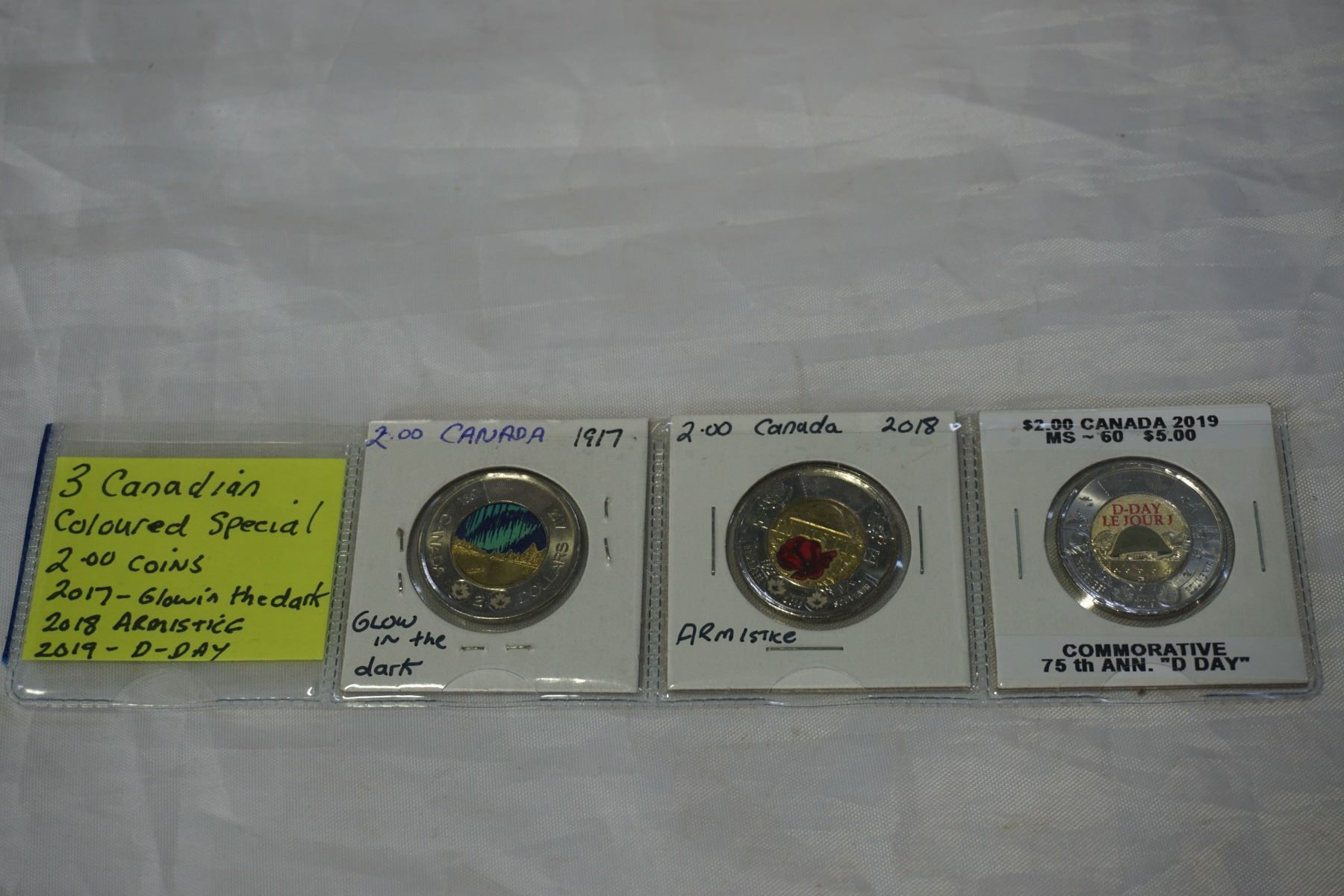 3 CANADIAN COLOURED $2 COINS 2017 GLOW IN THE DARK 2018 ARMISTICE, 2019 D-DAY COINS