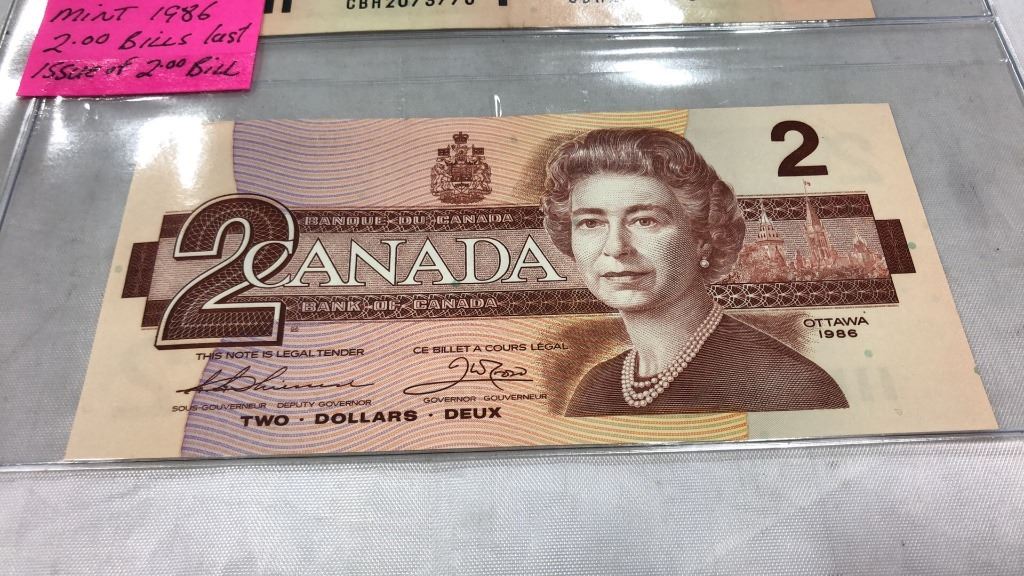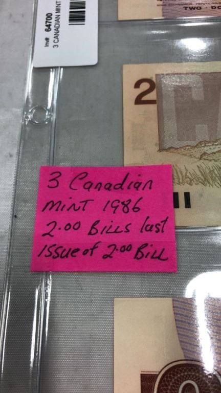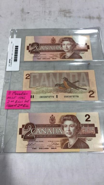 3 CANADIAN MINT 1986 2 DOLLAR BILLS LAST ISSUE OF THE 2 DOLLAR BILL