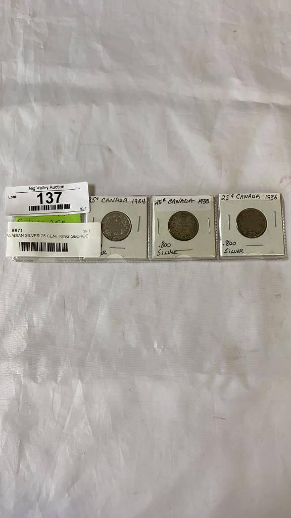3 CANADIAN SILVER 25 CENT KING GEORGE V 1934, 1935, 1936 .800 SILVER
