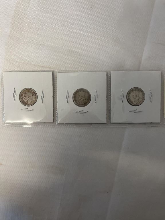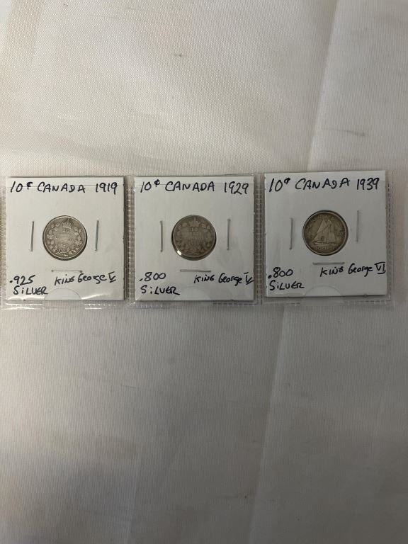 3 CANADIAN SILVER DIMES 1919 .925, 1929, 1939 .800 SILVER