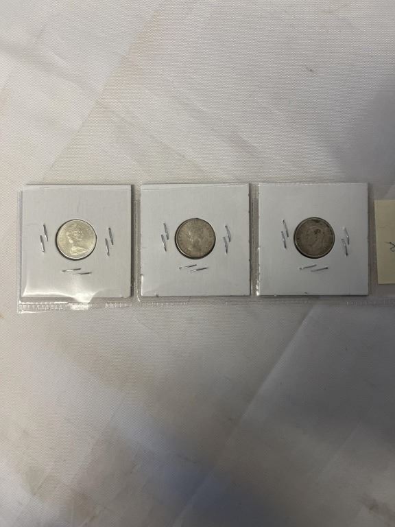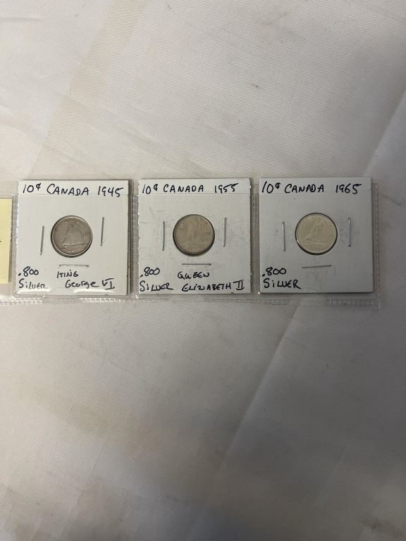 3 CANADIAN SILVER DIMES 1945, 1955, 1965 .800 SILVER