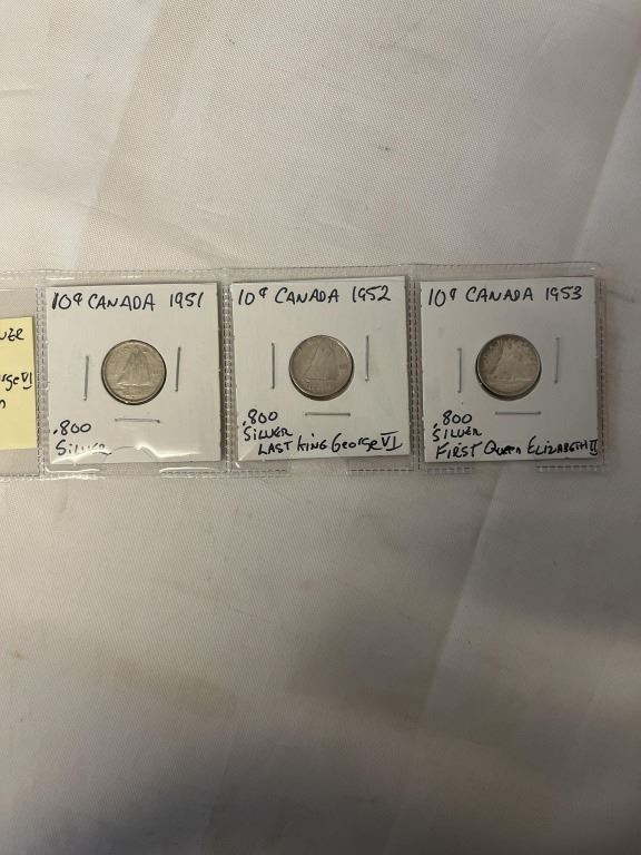 3 CANADIAN SILVER DIMES 1951, 1952, LAST KING GEORGE II, 1953 FIRST QUEEN ELIZABETH II .800 SILVER
