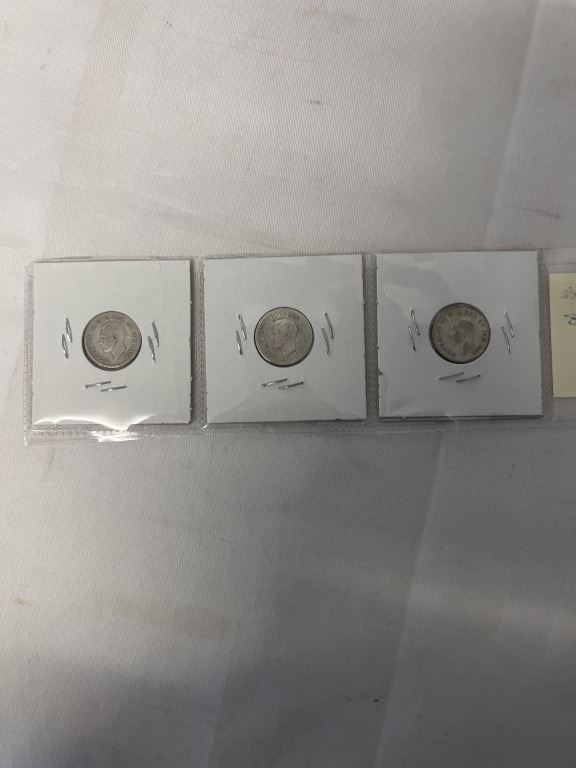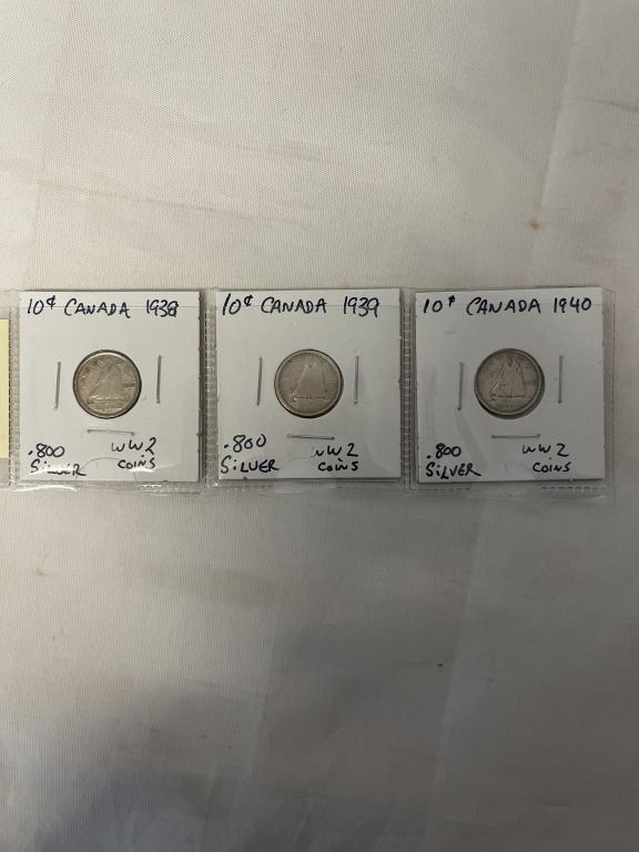 3 CANADIAN SILVER WW2 DIMES 1938, 1939, 1940 .800 SILVER