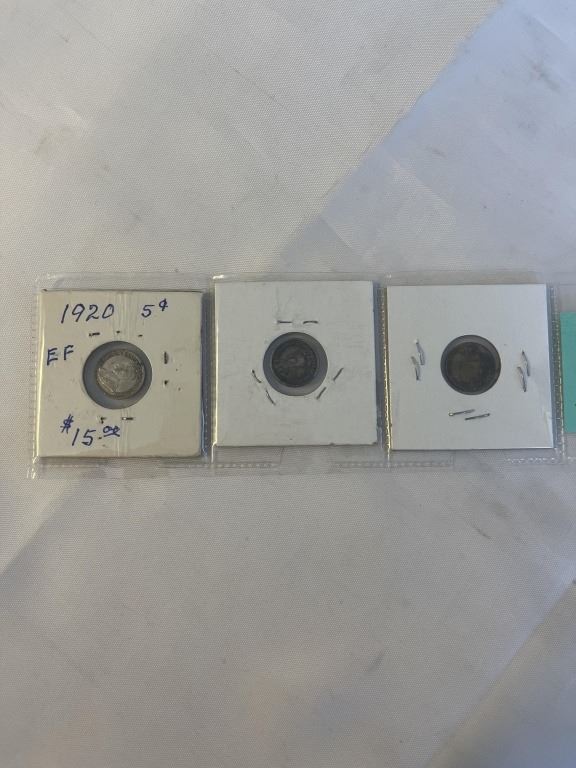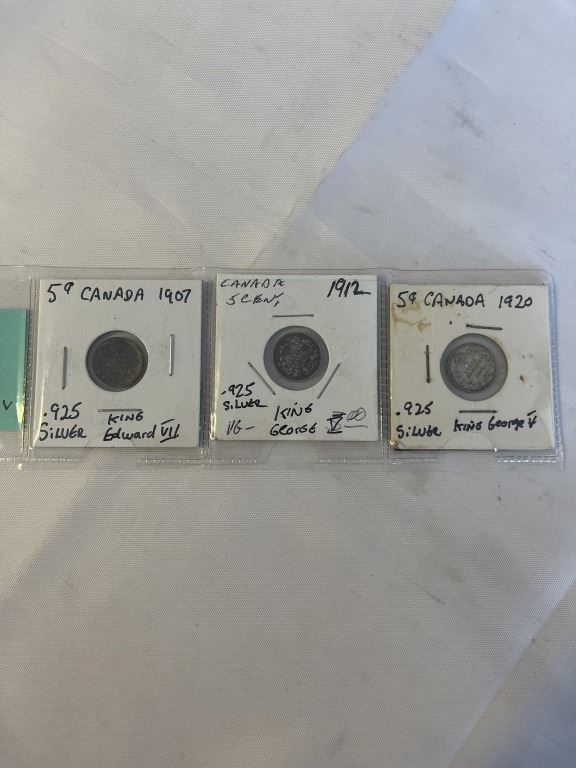 3 CANADIAN SMALL 5 CENTS, 1907 EDWARD VII, 1912 AND 1920 GEORGE V