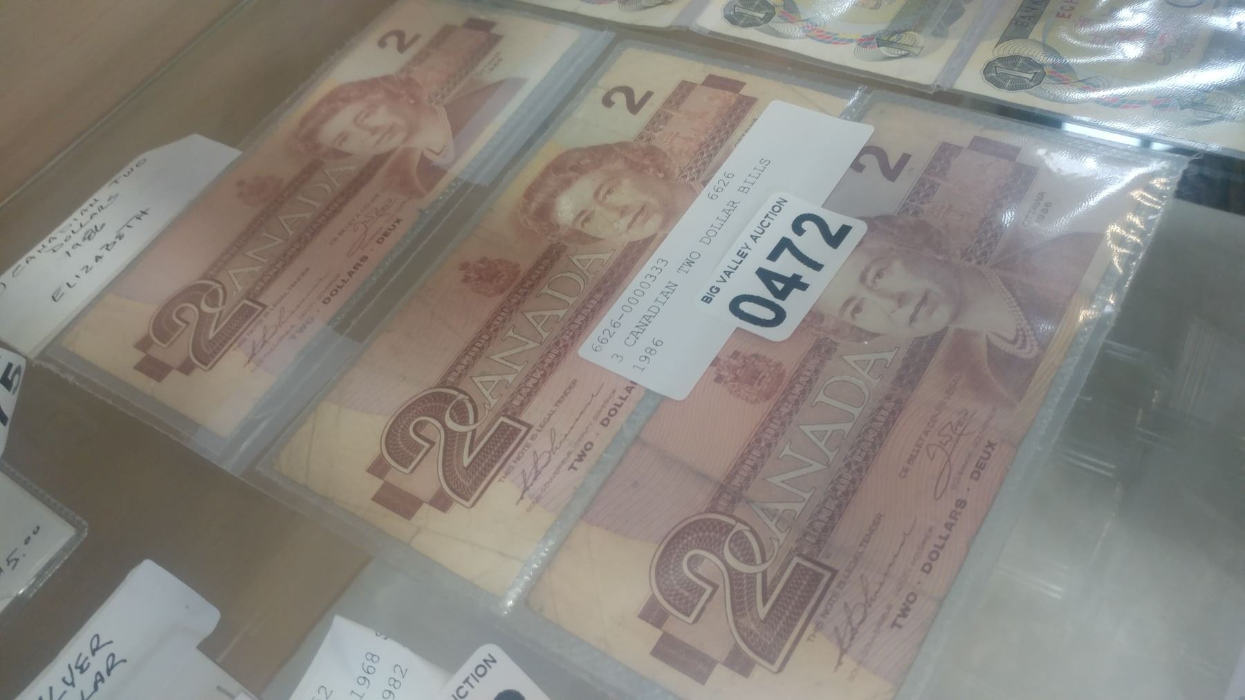 3 CANADIAN TWO DOLLAR BILLS 1986