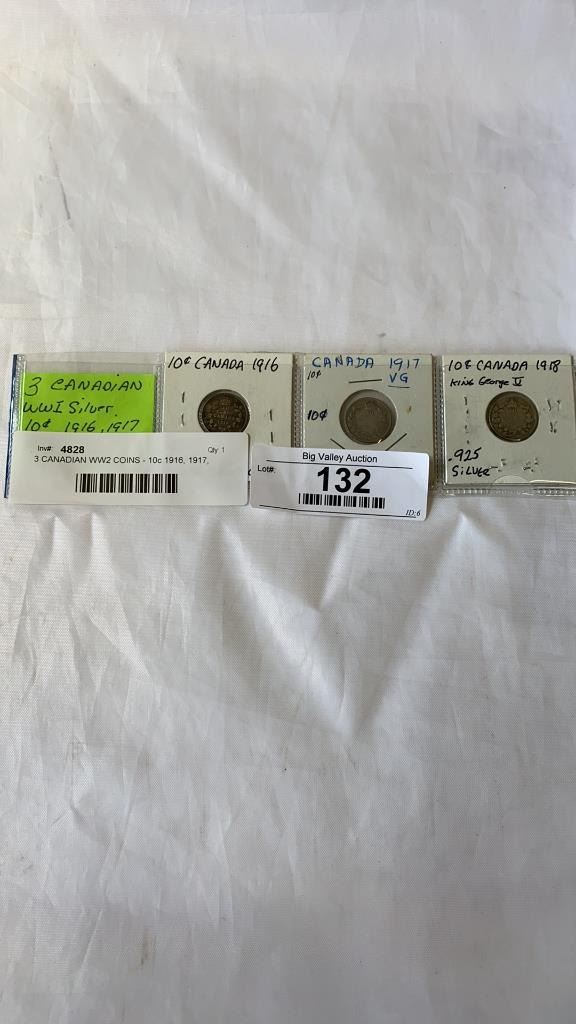 3 CANADIAN WW2 COINS - 10c 1916, 1917, 1918 .925 SILVER