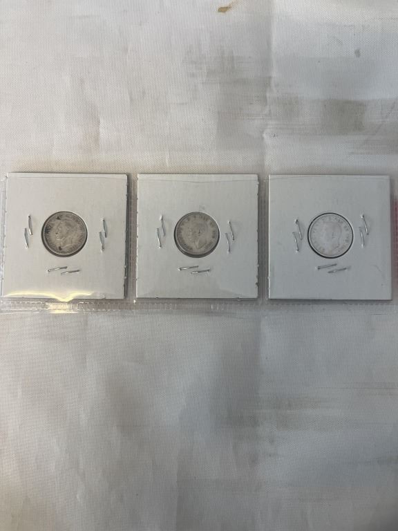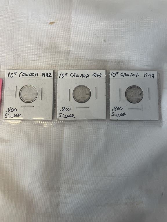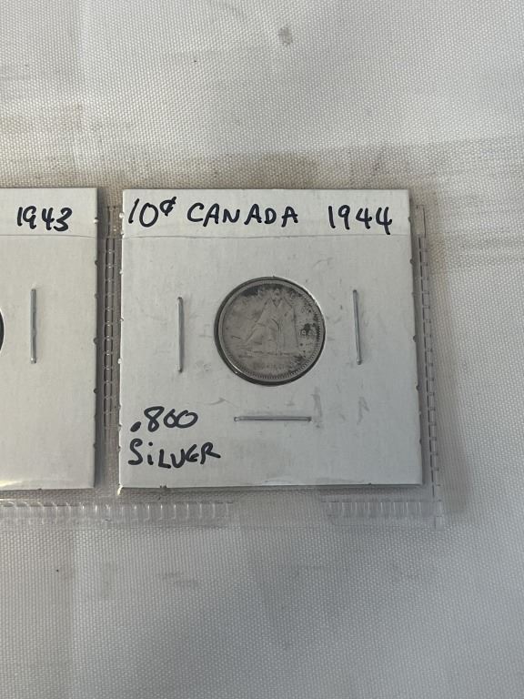 3 CANADIAN WWII SILVER KING GEORGE VI 10 CENT 1942, 1943, 1944 .900 SILVER