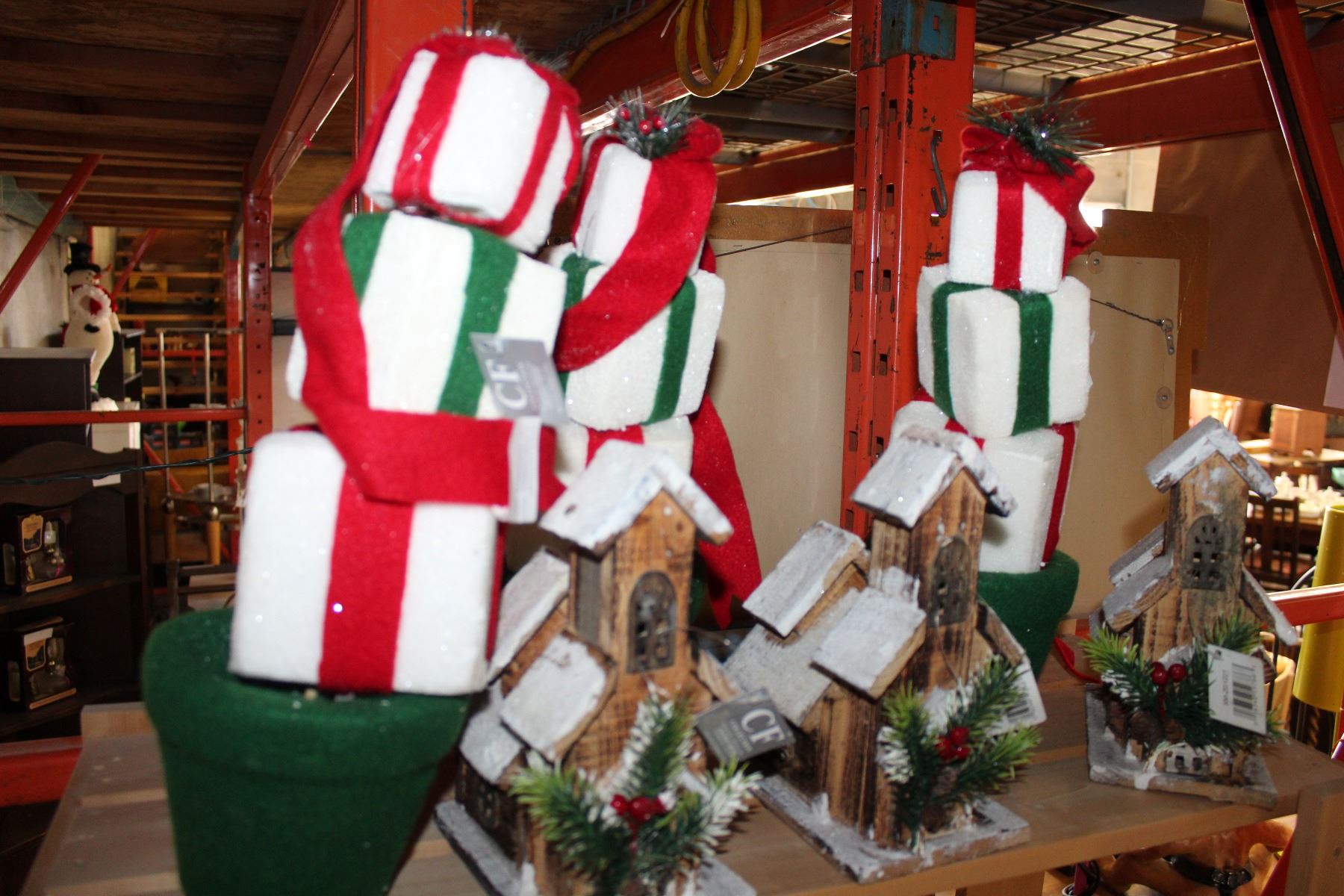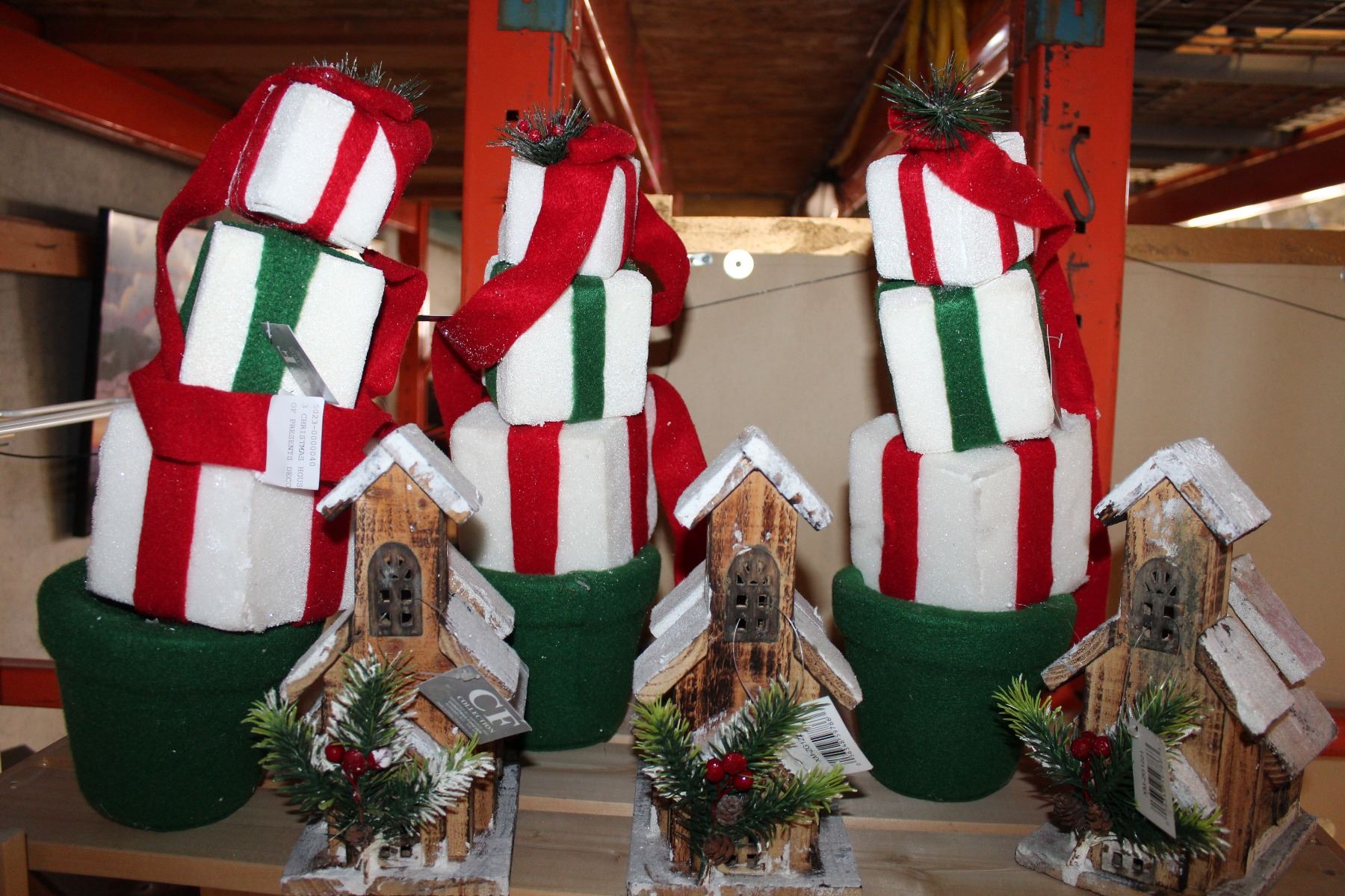3 CHRISTMAS HOUSES AND 3 STACK OF PRESENTS DECORATIONS