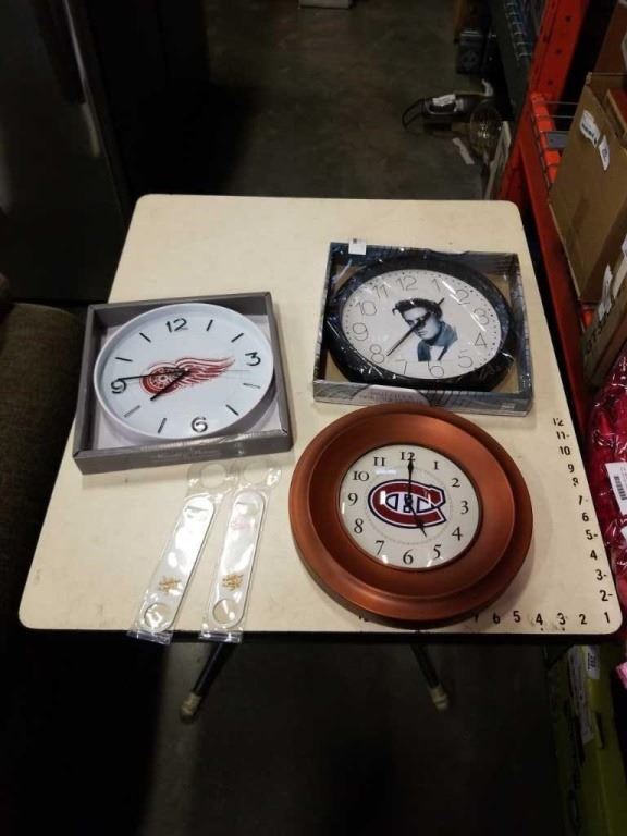 3 CLOCKS - ELVIS, REDWINGS AND CANADIENS AND 2 CZECHWAR BOTTLE OPENERS
