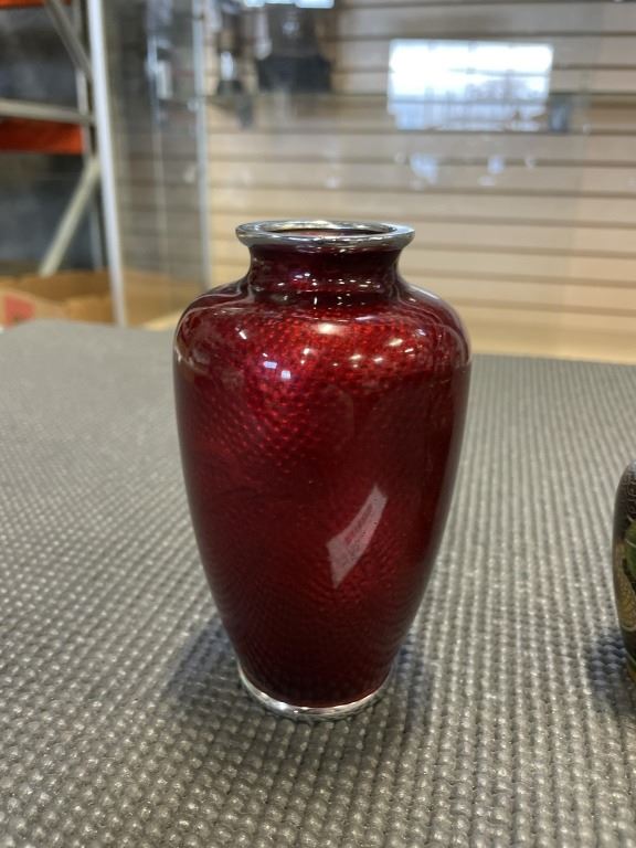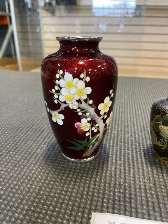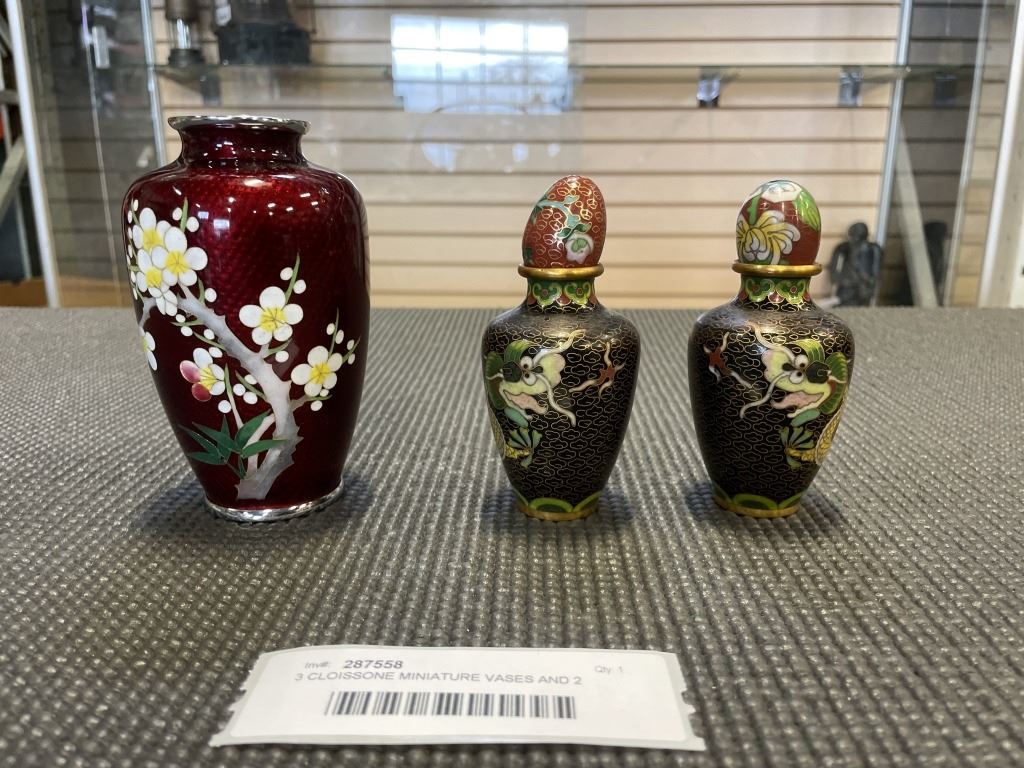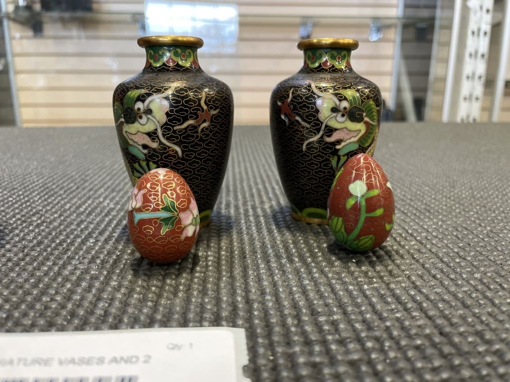 3 CLOISSONE MINIATURE VASES AND 2 EGGS