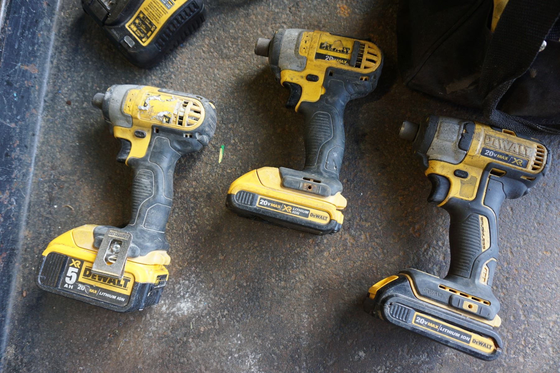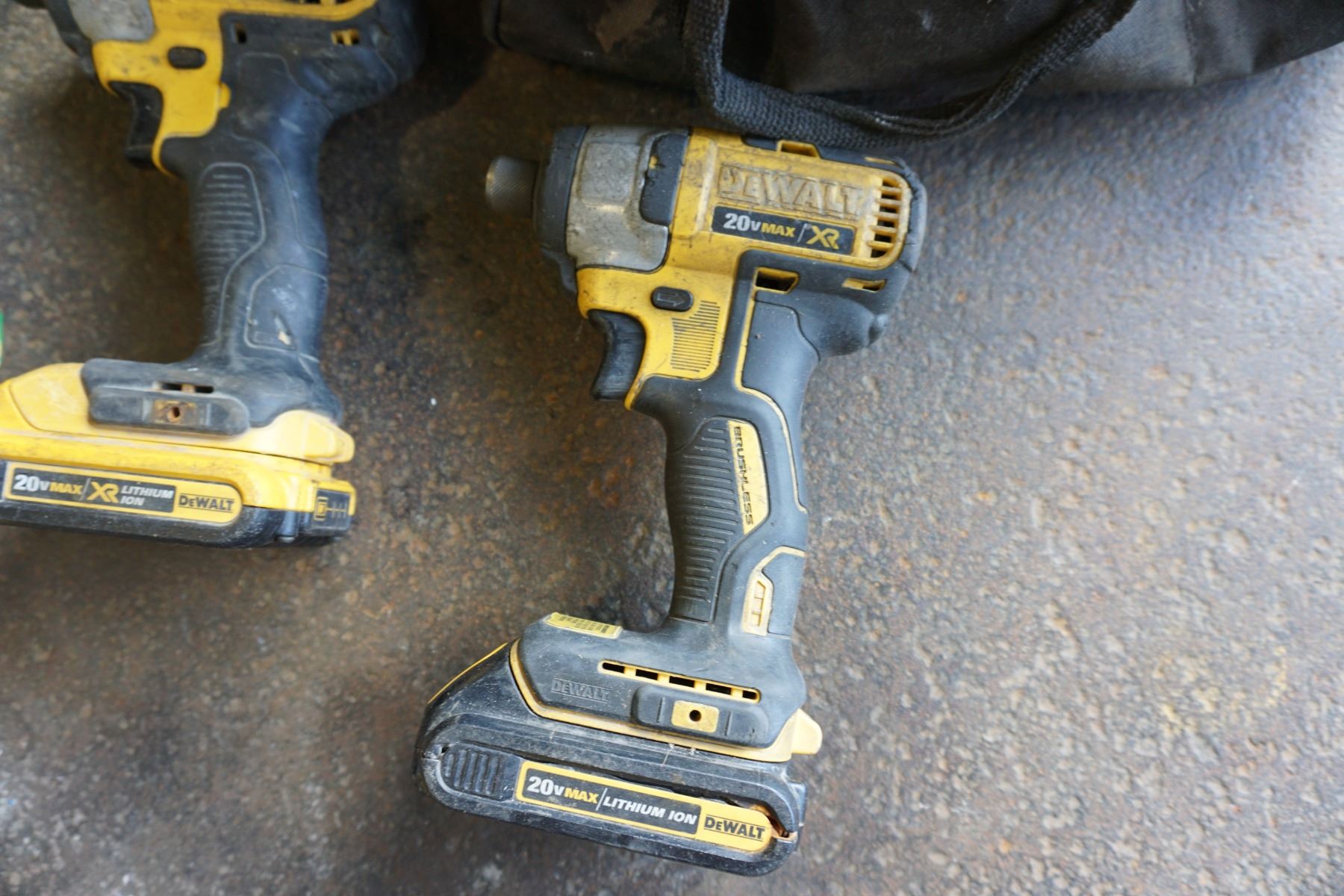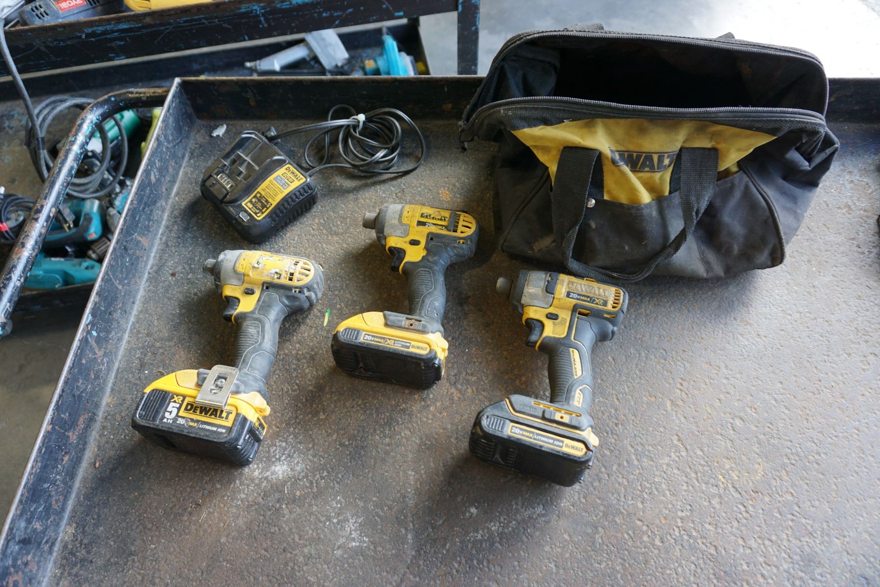 3 DEWALT 20V LITHIUM IMPACT GUNS W/ 3 BATTERIES, CHARGER, AND BAG - TESTED WORKING