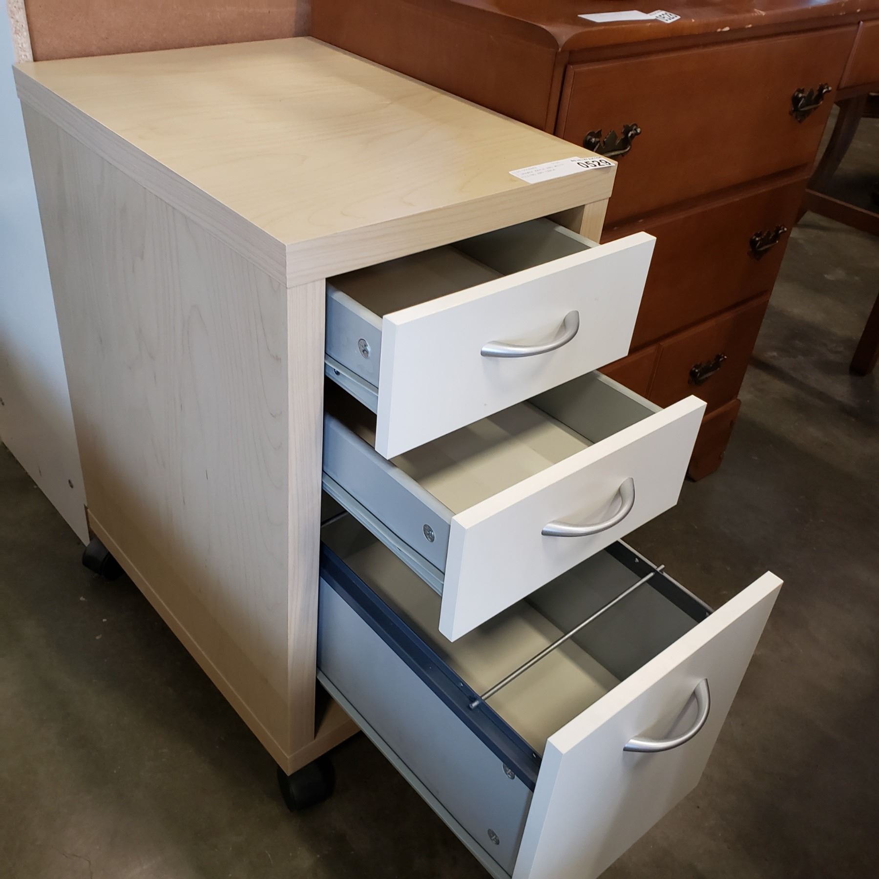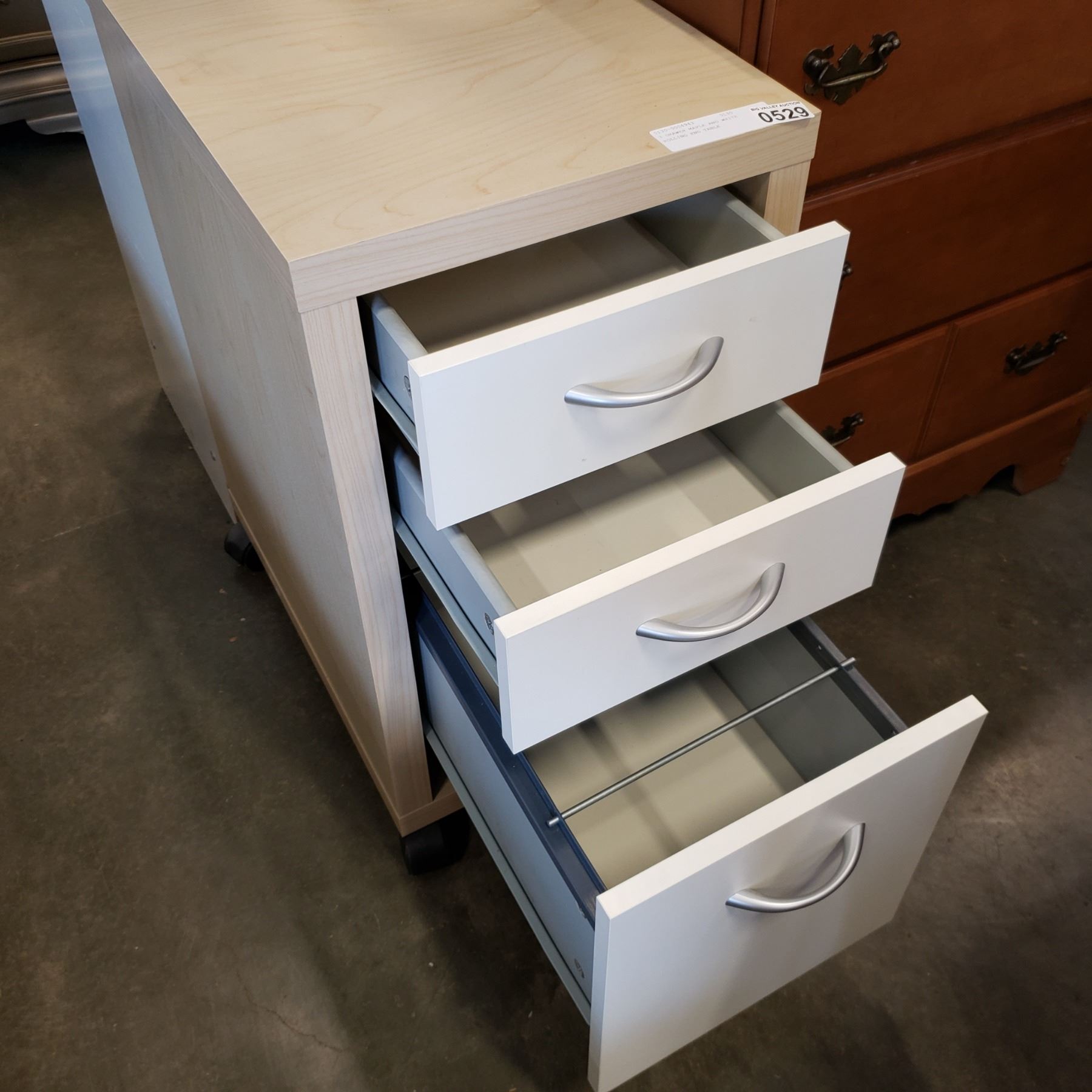 3 DRAWER MAPLE AND WHITE ROLLING END TABLE