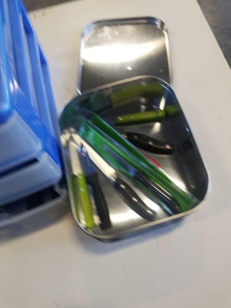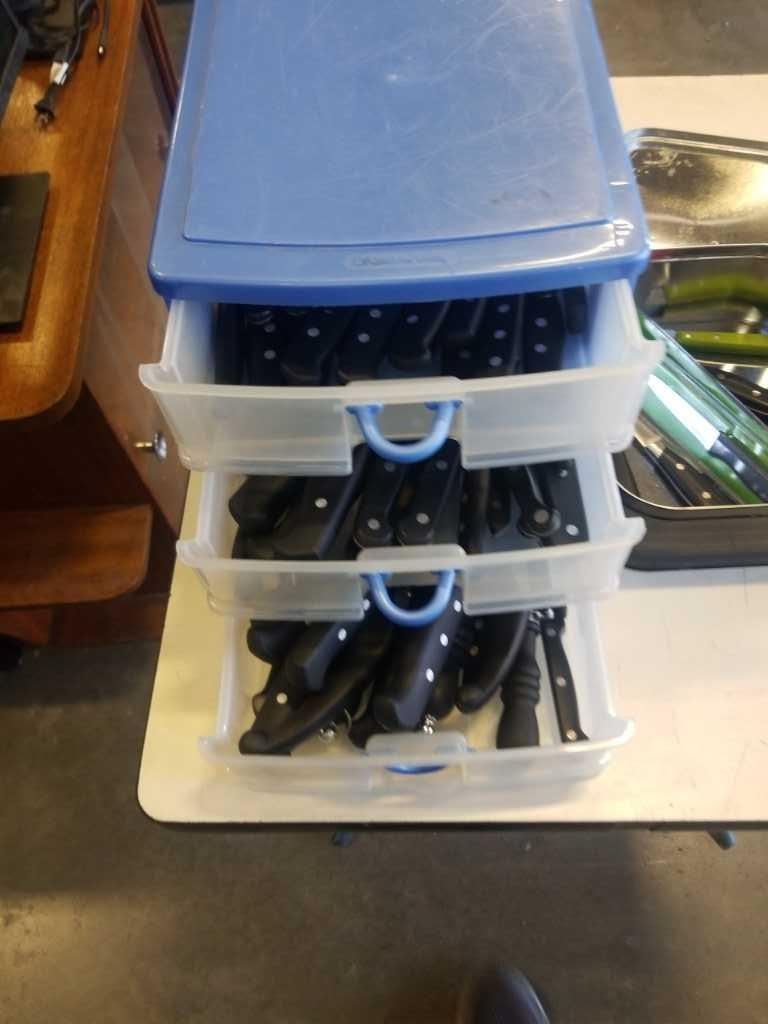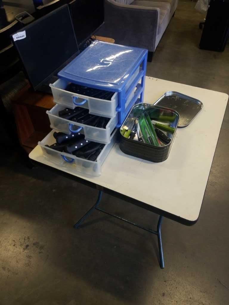 3 DRAWER ORGANIZER FULL OF KNIVES WITH TIN OF KNIVES