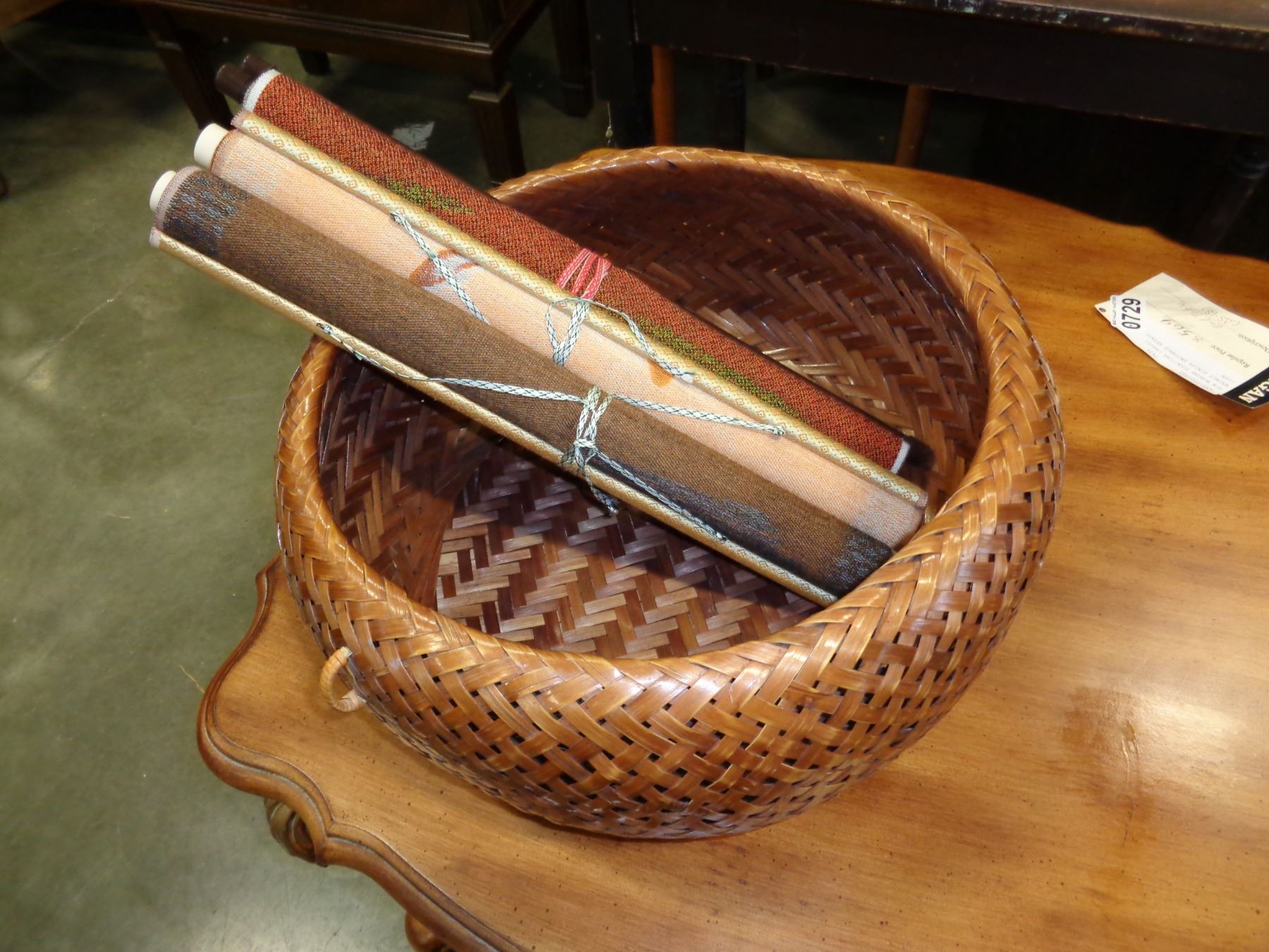 3 EMBROIDERED TAPESTRIES AND WOVEN BASKET