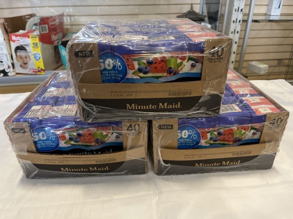 3 FLATS OF MINUTEMAID WATERMELON BLUEBERRY JUICE BOXES - 9 PACKS OF 8 JUICE BOXES, BEST BEFORE JULY 10/24